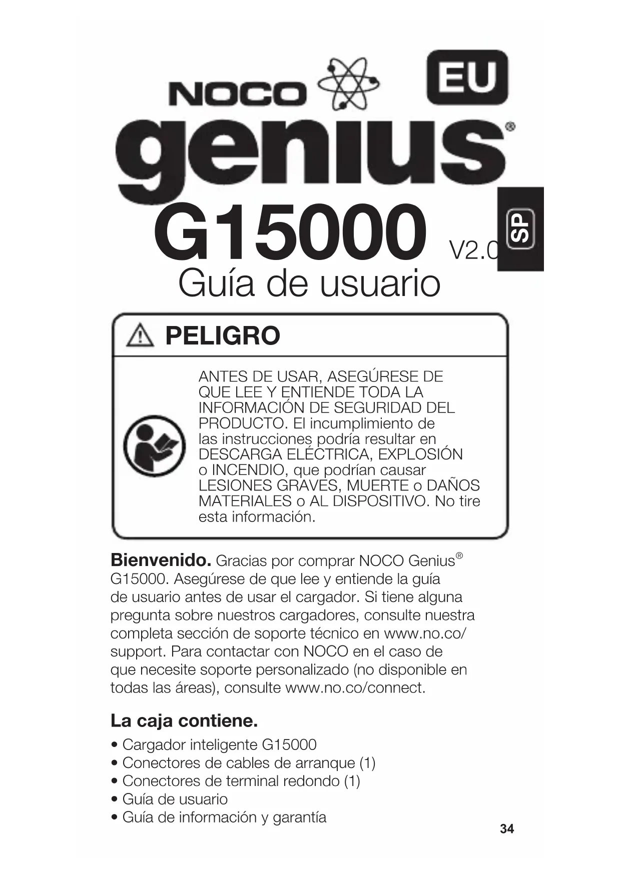 - Cargador inteligente G15000• Conectores de cables de arranque (1) • Conectores de terminal redondo (1)• Guía de usuario• Guía de información y garantía Guía de usuario G15000 V2.0 ANTES DE USAR, ASEGÚRESE DE QUE LEE Y ENTIENDE TODA LA INFORMACIÓN DE SEGURIDAD DEL PRODUCTO. El incumplimiento de las instrucciones podría resultar en DESCARGA ELÉCTRICA, EXPLOSIÓN o INCENDIO, que podrían causar LESIONES GRAVES, MUERTE o DAÑOS MATERIALES o AL DISPOSITIVO. No tire esta información. PELIGROContacte con NOCO. Acerca de G15000. El NOCO Genius