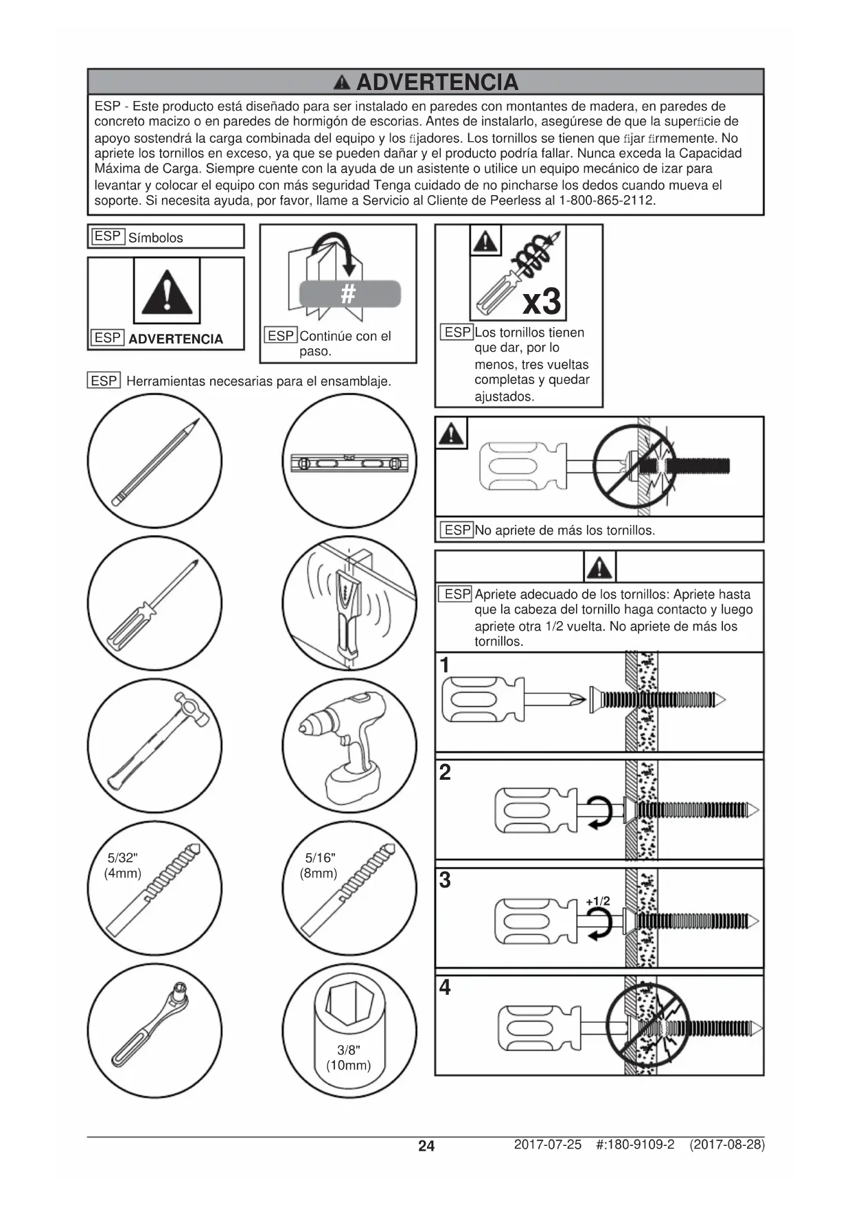 16" - 24" (41cm - 61cm) ESP - Cuando vaya a instalar soportes de pared de Peerless en paredes con montantes de madera recubiertas con yeso-cartón (gypsum board) verifi que que los montantes tengan un tamaño mínimo de 2" x 4". No instale en yeso-cartón (gypsum board) de más de 5/8" de grosor. ADVERTENCIA32 2017-07-25 #:180-9109-2 (2017-08-28) G (4)