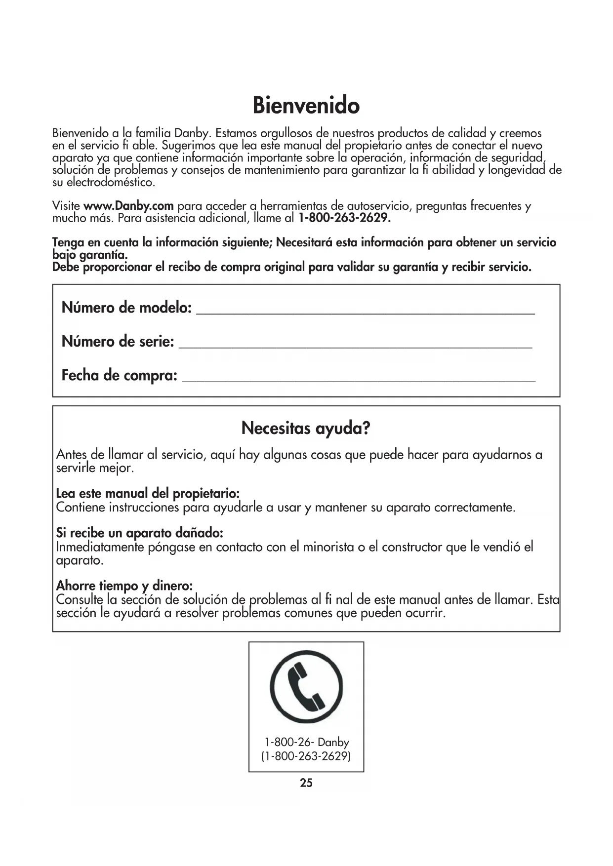 Danby cuidado del consumidor: 1-800-263-2629 Horas de operación: Lunes a Jueves 8:30 am - 6:00 pm Hora estándar del este Viernes 8:30 am - 4:00 pm Hora estándar del este La información de este manual está sujeta a cambios sin previo aviso.