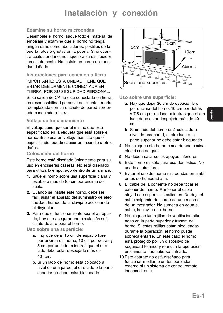 Uso sobre una superficie: a. Hay que dejar 30 cm de espacio libre por encima del horno, 10 cm por detrás y 7.5 cm por un lado, mientras que el otro lado debe estar despejado más de 40 cm. b. Si un lado del horno está colocado a nivel de una pared, el otro lado o la parte superior no debe estar bloqueado.