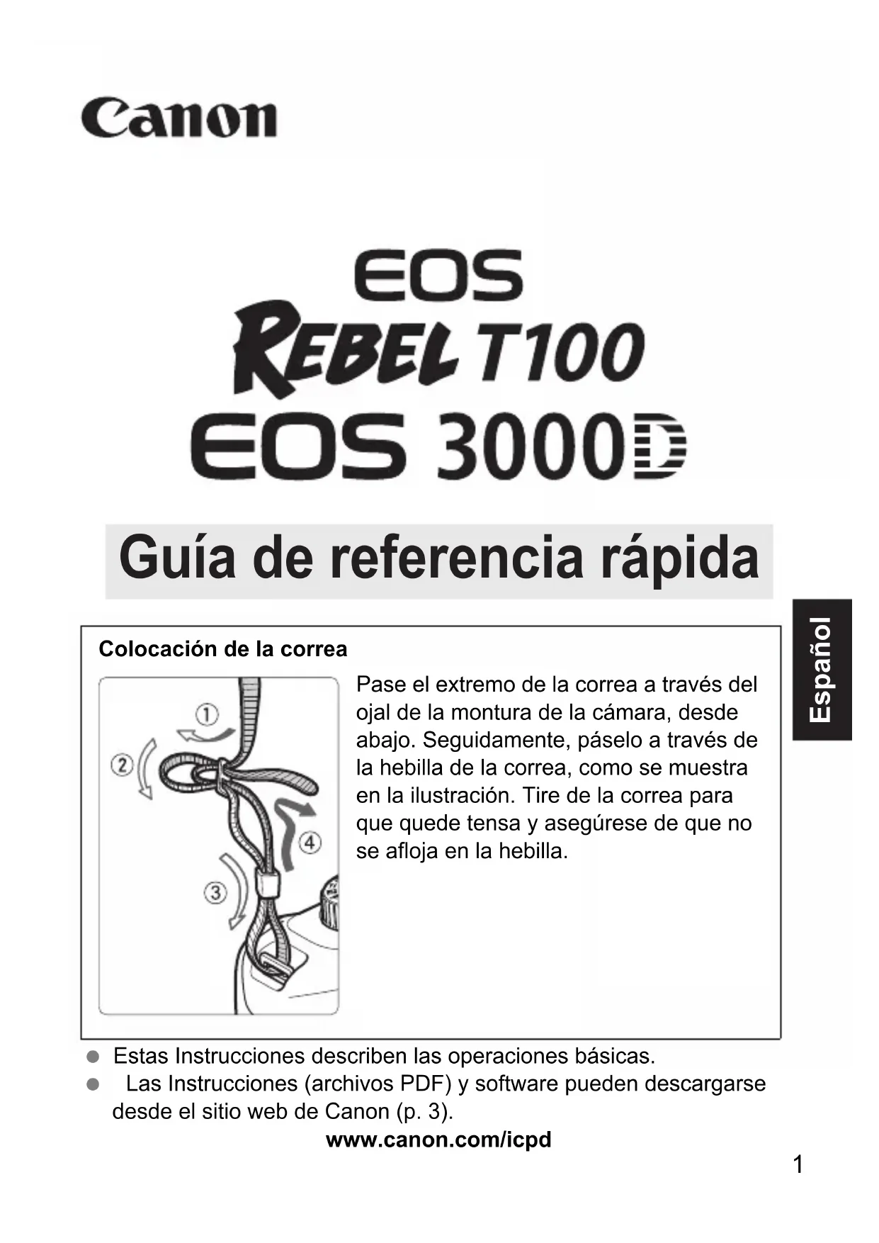 - Se proporciona el cargador de batería LC-E10 o LC-E10E. (El LC-E10E incluye un cable de alimentación). La cámara no incluye un CD-ROM de software, un cable de interfaz ni un cable HDMI. En la página siguiente se detallan las Instrucciones que se proporcionan. Si adquirió un kit con objetivo, compruebe que se hayan incluido los objetivos. Procure no perder ninguno de los elementos mencionados. Lista de comprobación de elementos Batería LP-E10 (con tapa protectora) Cargador de batería LC-E10/LC-E10E* Correa Cámara (con marco del ocular y tapa del cuerpo) Cuando necesite las Instrucciones de objetivos, puede descargarlas desde el sitio web de Canon (p. 3). Las Instrucciones de objetivos (PDF) son para objetivos que se venden por separado. Tenga en cuenta que cuando adquiere el kit con objetivos, algunos de los accesorios incluidos con el objetivo pueden no coincidir con los que figuran en las Instrucciones de objetivos. Puede descargar el software desde el sitio web de Canon para su uso.3 Guía de referencia rápida El folleto describe las operaciones básicas. Instrucciones más detalladas (archivos PDF) pueden descargarse desde el sitio web de Canon. 1 Descargue las Instrucciones (archivos PDF). Conéctese a Internet y acceda al siguiente sitio web de Canon. www.canon.com/icpd Seleccione su país o región de residencia y descargue las Instrucciones. Instrucciones disponibles para descargar
