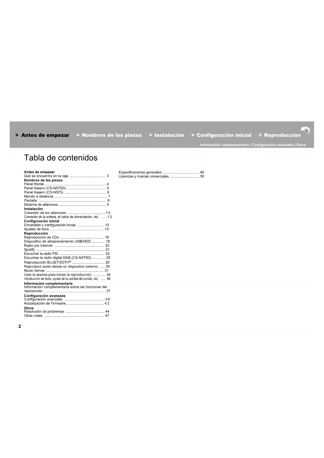 - Licencias y marcas comerciales Es > Antes de empezar > Nombres de las piezas > Instalación > Configuración inicial > Reproducción Información complementaria | Configuración avanzada | Otros p. 50