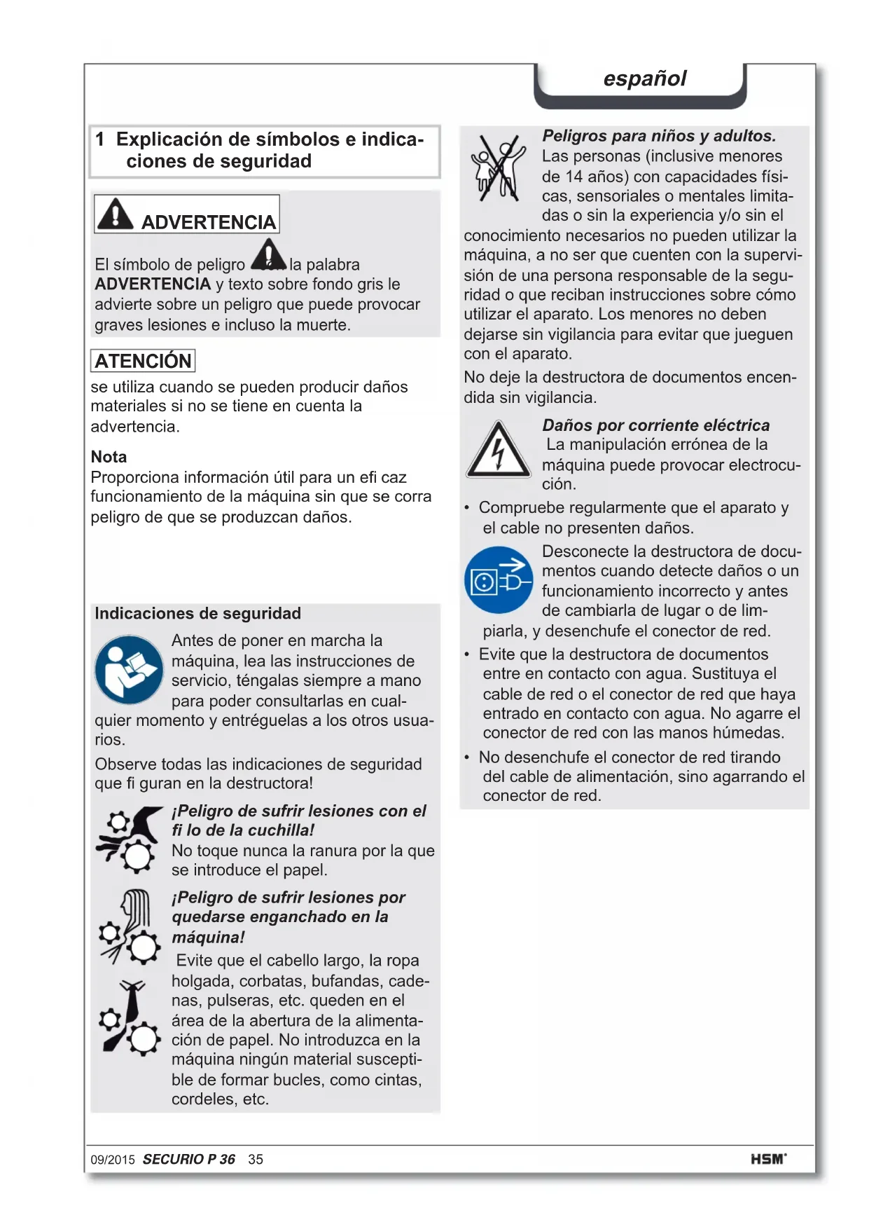 - Il numero massimo di fogli (DIN A4, 70 g/m² e 80 g/m²), introdotti longitudinalmente, che vengono tagliati in un unico passaggio. I risultati di capacità indicati vengono calcolati utilizzando un utensile da taglio nuovo e lubrifi cato e un motore freddo. Una tensione di rete più debole o una frequenza di rete diversa da quella indicata possono determi- nare una riduzione della capacità di taglio e un aumento del suono di scorrimento. La capacità di taglio può variare a seconda della struttura e delle caratteristiche della carta e dal tipo di immissione. I risultati di capacità in 80 g/m² sono valori calcolati.09/2015 SECURIO P 36 35 español 1 Explicación de símbolos e indica- ciones de seguridad Nota Proporciona información útil para un efi caz funcionamiento de la máquina sin que se corra peligro de que se produzcan daños. ADVERTENCIA El símbolo de peligro con la palabra ADVERTENCIA y texto sobre fondo gris le advierte sobre un peligro que puede provocar graves lesiones e incluso la muerte. Indicaciones de seguridad Antes de poner en marcha la máquina, lea las instrucciones de servicio, téngalas siempre a mano para poder consultarlas en cual- quier momento y entréguelas a los otros usua- rios. Observe todas las indicaciones de seguridad que fi guran en la destructora! ¡Peligro de sufrir lesiones con el fi lo de la cuchilla! No toque nunca la ranura por la que se introduce el papel. ¡Peligro de sufrir lesiones por quedarse enganchado en la máquina! Evite que el cabello largo, la ropa holgada, corbatas, bufandas, cade- nas, pulseras, etc. queden en el área de la abertura de la alimenta- ción de papel. No introduzca en la máquina ningún material suscepti- ble de formar bucles, como cintas, cordeles, etc. Peligros para niños y adultos. Las personas (inclusive menores de 14 años) con capacidades físi- cas, sensoriales o mentales limita- das o sin la experiencia y/o sin el conocimiento necesarios no pueden utilizar la máquina, a no ser que cuenten con la supervi- sión de una persona responsable de la segu- ridad o que reciban instrucciones sobre cómo utilizar el aparato. Los menores no deben dejarse sin vigilancia para evitar que jueguen con el aparato. No deje la destructora de documentos encen- dida sin vigilancia. Daños por corriente eléctrica La manipulación errónea de la máquina puede provocar electrocu- ción.