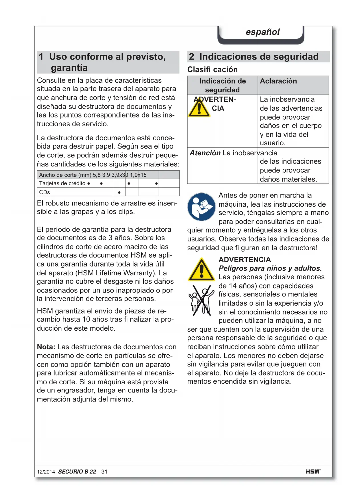 - Dire va RoHS 2011/65/UE La dichiarazione di conformità UE può essere richiesta al produ ore.12/2014 SECURIO B 22 31 español 2 Indicaciones de seguridad Clasifi cación Indicación de seguridad Aclaración ADVERTEN- CIA La inobservancia de las advertencias puede provocar daños en el cuerpo y en la vida del usuario. Atención La inobservancia de las indicaciones puede provocar daños materiales. Antes de poner en marcha la máquina, lea las instrucciones de servicio, téngalas siempre a mano para poder consultarlas en cual- quier momento y entréguelas a los otros usuarios. Observe todas las indicaciones de seguridad que fi guran en la destructora! ADVERTENCIA Peligros para niños y adultos. Las personas (inclusive menores de 14 años) con capacidades físicas, sensoriales o mentales limitadas o sin la experiencia y/o sin el conocimiento necesarios no pueden utilizar la máquina, a no ser que cuenten con la supervisión de una persona responsable de la seguridad o que reciban instrucciones sobre cómo utilizar el aparato. Los menores no deben dejarse sin vigilancia para evitar que jueguen con el aparato. No deje la destructora de docu- mentos encendida sin vigilancia. 1 Uso conforme al previsto, garantía Consulte en la placa de características situada en la parte trasera del aparato para qué anchura de corte y tensión de red está diseñada su destructora de documentos y lea los puntos correspondientes de las ins- trucciones de servicio. Ancho de corte (mm) 5,8 3,9 3,9x30 1,9x15 Tarjetas de crédito ●● ● ● CDs ● La destructora de documentos está conce- bida para destruir papel. Según sea el tipo de corte, se podrán además destruir peque- ñas cantidades de los siguientes materiales: El robusto mecanismo de arrastre es insen- sible a las grapas y a los clips. Nota: Las destructoras de documentos con mecanismo de corte en partículas se ofre- cen como opción también con un aparato para lubricar automáticamente el mecanis- mo de corte. Si su máquina está provista de un engrasador, tenga en cuenta la docu- mentación adjunta del mismo. El período de garantía para la destructora de documentos es de 3 años. Sobre los cilindros de corte de acero macizo de las destructoras de documentos HSM se apli- ca una garantía durante toda la vida útil del aparato (HSM Lifetime Warranty). La garantía no cubre el desgaste ni los daños ocasionados por un uso inapropiado o por la intervención de terceras personas. HSM garantiza el envío de piezas de re- cambio hasta 10 años tras fi nalizar la pro- ducción de este modelo.32 SECURIO B 22 12/2014 españolespañol ADVERTENCIA Tensión de red peligrosa. La manipulación errónea de la má quina puede provocar electro- cución. – Antes de enchufar el conector de red, compruebe que la tensión y la frecuencia de su red eléctrica coincidan con las indi- caciones de la placa de características. – Preste atención a que el conector de red esté fácilmente accesible. – Evite que la destructora de documentos entre en contacto con agua. Sustituya el cable de red o el conector de red que haya entrado en contacto con agua. – No agarre el conector de red con las ma- nos húmedas. – No desenchufe el conector de red tirando del cable de alimentación, sino agarrando el conector de red. – Utilice el aparato únicamente en interio- res secos. No lo ponga en funcionamien- to en entornos húmedos o expuesto a la lluvia. Compruebe regularmente que el aparato y el cable no presenten daños. Desconecte la destructora de documentos cuando detecte daños o un funcionamiento incorrecto y antes de cambiarla de lugar o de limpiar- la, y desenchufe el conector de red. – Mantenga el aparato, el conector de red y el cable de red alejados de llamas abier- tas y de superfi cies calientes. Las ranu- ras de ventilación no deben estar obstrui- das y debe mantenerse una distancia a la pared o a los muebles de como mínimo 5 cm. Los trabajos de mantenimiento que involucren quitar las cubiertas de la carcasa sólo deben ser realizados por el servicio postven- ta de HSM o los técnicos de servi- cio de nuestras partes contratantes. Para las direcciones de los servicios postventa, véase la página 160