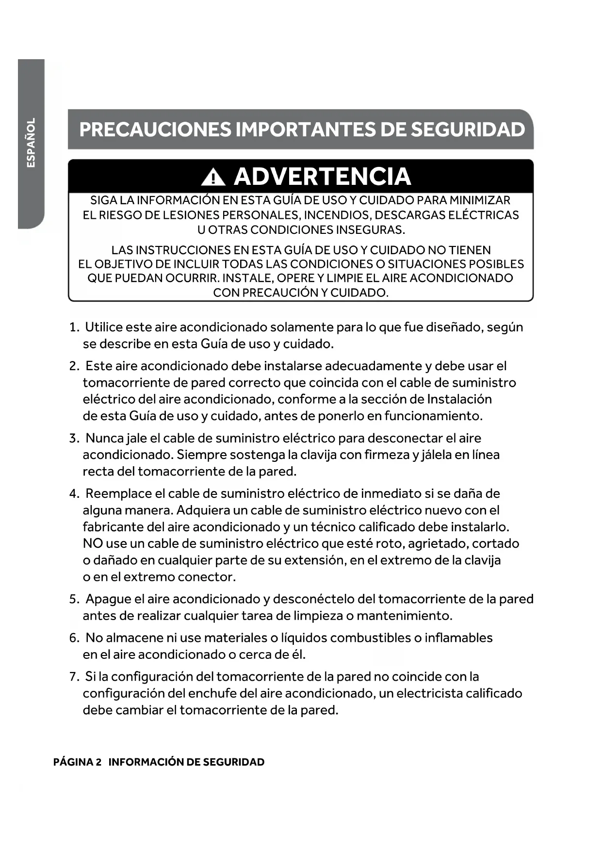 ESPAÑOL SIGA LA INFORMACIÓN EN ESTA GUÍA DE USO Y CUIDADO PARA MINIMIZAR ELRIESGO DE LESIONES PERSONALES, INCENDIOS, DESCARGAS ELÉCTRICAS UOTRAS CONDICIONES INSEGURAS. LAS INSTRUCCIONES EN ESTA GUÍA DE USO Y CUIDADO NO TIENEN ELOBJETIVO DE INCLUIR TODAS LAS CONDICIONES O SITUACIONES POSIBLES QUE PUEDAN OCURRIR. INSTALE, OPERE Y LIMPIE EL AIRE ACONDICIONADO CON PRECAUCIÓN Y CUIDADO. ADVERTENCIA PRECAUCIONES IMPORTANTES DE SEGURIDADINFORMACIÓN DE SEGURIDAD PÁGINA 3 ESPAÑOL
