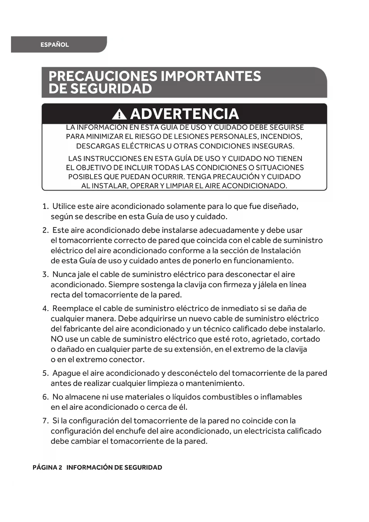 LA INFORMACIÓN EN ESTA GUÍA DE USO Y CUIDADO DEBE SEGUIRSE PARAMINIMIZAR EL RIESGO DE LESIONES PERSONALES, INCENDIOS, DESCARGAS ELÉCTRICAS U OTRAS CONDICIONES INSEGURAS. LAS INSTRUCCIONES EN ESTA GUÍA DE USO Y CUIDADO NO TIENEN ELOBJETIVO DE INCLUIR TODAS LAS CONDICIONES O SITUACIONES POSIBLESQUE PUEDAN OCURRIR. TENGA PRECAUCIÓN Y CUIDADO ALINSTALAR, OPERAR Y LIMPIAR EL AIRE ACONDICIONADO. ADVERTENCIA PRECAUCIONES IMPORTANTES