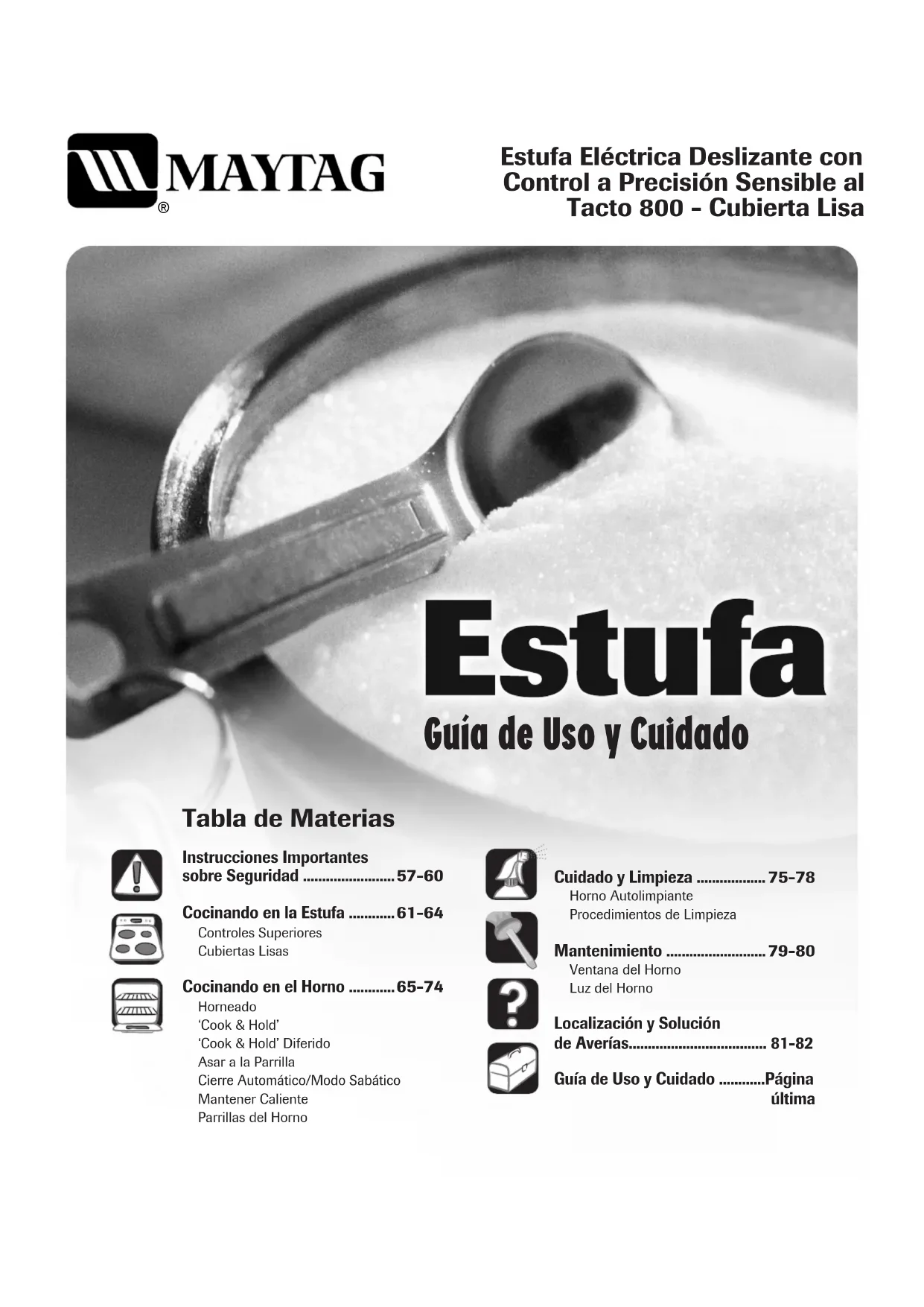 Cuidado y Limpieza .................. 75-78 Horno Autolimpiante Procedimientos de Limpieza Mantenimiento .......................... 79-80 Ventana del Horno Luz del Horno Localización y Solución de Averías.................................... 81-82 Guía de Uso y Cuidado ............Página última Guía de Uso y Cuidado57 Instalador: Por favor deje esta guía junto con elelectrodoméstico.Consumidor: Por favor lea y conserve esta guía para referenciafutura. Conserve el recibo de compra y/o el cheque canceladocomo comprobante de compra.Número de Modelo ___________________________________Número de Serie _____________________________________Fecha de Compra ____________________________________Si tiene preguntas, llame a:Servicio a los clientes1-800-688-9900 EE. UU.1-800-688-2002 Canadá(Lunes a Viernes, 8:00 a.m. a 8:00 p.m. Hora del Este)Internet: http://www.maytag.comEn nuestro continuo afán de mejorar la calidad y rendimiento denuestros electrodomésticos, puede que sea necesario modificarel electrodoméstico sin actualizar esta guía.Para información sobre servicio, ver la página última. Las advertencias e instrucciones importantes sobre seguridad que aparecen en esta guía no están destinadas a cubrir todas las posibles circunstancias y situaciones que puedan ocurrir. Se debe ejercer sentido común, precaución y cuidado cuando instale, realice mantenimiento o haga funcionar el artefacto. Siempre póngase en contacto con el fabricante si surgen problemas o situaciones que usted no comprenda. Reconozca los símbolos, advertencias, etiquetas de seguridad ADVERTENCIA Lea y siga todas las instrucciones antes de usar este electrodoméstico para evitar el riesgo potencial de incendio, choque eléctrico, lesión personal o daño al electrodoméstico como resultado de su uso inapropiado. Utilice este electrodoméstico solamente para el propósito que ha sido destinado según se describe en esta guía. ADVERTENCIA - Peligro o prácticas no seguras que PODRIAN causar lesión personal grave o mortal. PRECAUCIÓN - Peligros o prácticas no seguras que PODRIAN causar lesión personal menos grave. Para asegurar funcionamiento correcto y seguro: El electrodoméstico debe ser instalado debidamente y puesto a tierra por un técnico calificado. No intente ajustar, reparar, prestar servicio o reemplazar ninguna pieza de este producto a menos que sea específicamente recomendado en esta guía. Todas las reparaciones deben ser realizadas por un técnico calificado. Siempre desenchufe el electrodoméstico antes de efectuar alguna reparación. ADVERTENCIA