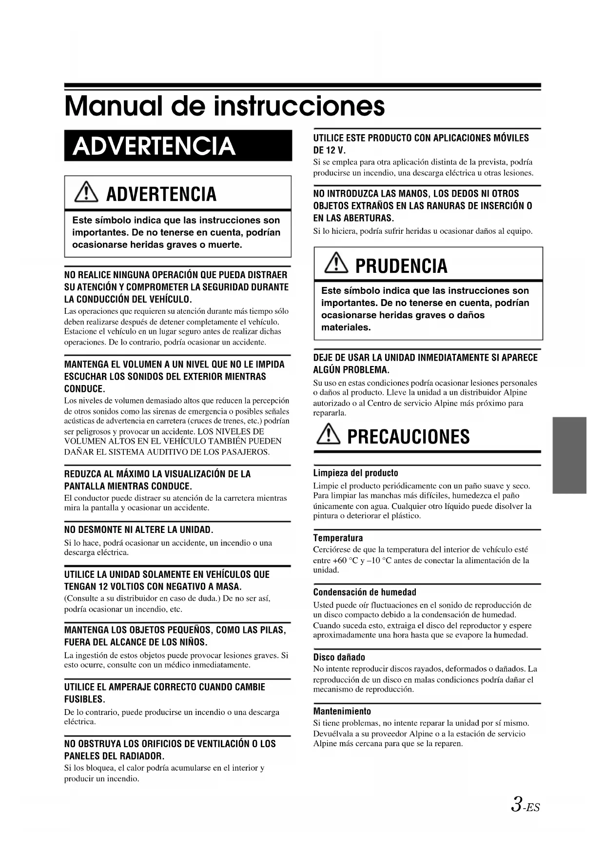 - Conexiones 01ES00CDE121.book Page 2 Monday, December 13, 2010 2:26 PM3-ES 01ES03CDE121.fm ALPINE CDE-121 68-16909Z79-A (ES) Manual de instrucciones NO REALICE NINGUNA OPERACIÓN QUE PUEDA DISTRAER SU ATENCIÓN Y COMPROMETER LA SEGURIDAD DURANTE LA CONDUCCIÓN DEL VEHÍCULO.Las operaciones que requieren su atención durante más tiempo sólo deben realizarse después de detener completamente el vehículo. Estacione el vehículo en un lugar seguro antes de realizar dichas operaciones. De lo contrario, podría ocasionar un accidente.MANTENGA EL VOLUMEN A UN NIVEL QUE NO LE IMPIDA ESCUCHAR LOS SONIDOS DEL EXTERIOR MIENTRAS CONDUCE.Los niveles de volumen demasiado altos que reducen la percepción de otros sonidos como las sirenas de emergencia o posibles señales acústicas de advertencia en carretera (cruces de trenes, etc.) podrían ser peligrosos y provocar un accidente. LOS NIVELES DE VOLUMEN ALTOS EN EL VEHÍCULO TAMBIÉN PUEDEN DAÑAR EL SISTEMA AUDITIVO DE LOS PASAJEROS.REDUZCA AL MÁXIMO LA VISUALIZACIÓN DE LA PANTALLA MIENTRAS CONDUCE.El conductor puede distraer su atención de la carretera mientras mira la pantalla y ocasionar un accidente.NO DESMONTE NI ALTERE LA UNIDAD.Si lo hace, podrá ocasionar un accidente, un incendio o una descarga eléctrica.UTILICE LA UNIDAD SOLAMENTE EN VEHÍCULOS QUE TENGAN 12 VOLTIOS CON NEGATIVO A MASA.(Consulte a su distribuidor en caso de duda.) De no ser así, podría ocasionar un incendio, etc.MANTENGA LOS OBJETOS PEQUEÑOS, COMO LAS PILAS, FUERA DEL ALCANCE DE LOS NIÑOS.La ingestión de estos objetos puede provocar lesiones graves. Si esto ocurre, consulte con un médico inmediatamente.UTILICE EL AMPERAJE CORRECTO CUANDO CAMBIE FUSIBLES.De lo contrario, puede producirse un incendio o una descarga eléctrica.NO OBSTRUYA LOS ORIFICIOS DE VENTILACIÓN O LOS PANELES DEL RADIADOR.Si los bloquea, el calor podría acumularse en el interior y producir un incendio.UTILICE ESTE PRODUCTO CON APLICACIONES MÓVILES DE 12 V.Si se emplea para otra aplicación distinta de la prevista, podría producirse un incendio, una descarga eléctrica u otras lesiones.NO INTRODUZCA LAS MANOS, LOS DEDOS NI OTROS OBJETOS EXTRAÑOS EN LAS RANURAS DE INSERCIÓN O EN LAS ABERTURAS.Si lo hiciera, podría sufrir heridas u ocasionar daños al equipo.DEJE DE USAR LA UNIDAD INMEDIATAMENTE SI APARECE ALGÚN PROBLEMA.Su uso en estas condiciones podría ocasionar lesiones personales o daños al producto. Lleve la unidad a un distribuidor Alpine autorizado o al Centro de servicio Alpine más próximo para repararla. PRECAUCIONES Limpieza del productoLimpie el producto periódicamente con un paño suave y seco. Para limpiar las manchas más difíciles, humedezca el paño únicamente con agua. Cualquier otro líquido puede disolver la pintura o deteriorar el plástico.TemperaturaCerciórese de que la temperatura del interior de vehículo esté entre +60 °C y –10 °C antes de conectar la alimentación de la unidad.Condensación de humedadUsted puede oír fluctuaciones en el sonido de reproducción de un disco compacto debido a la condensación de humedad. Cuando suceda esto, extraiga el disco del reproductor y espere aproximadamente una hora hasta que se evapore la humedad.Disco dañadoNo intente reproducir discos rayados, deformados o dañados. La reproducción de un disco en malas condiciones podría dañar el mecanismo de reproducción.MantenimientoSi tiene problemas, no intente reparar la unidad por sí mismo. Devuélvala a su proveedor Alpine o a la estación de servicio Alpine más cercana para que se la reparen. ADVERTENCIA ADVERTENCIA Este símbolo indica que las instrucciones son importantes. De no tenerse en cuenta, podrían ocasionarse heridas graves o muerte. PRUDENCIA Este símbolo indica que las instrucciones son importantes. De no tenerse en cuenta, podrían ocasionarse heridas graves o daños materiales. 01ES00CDE121.book Page 3 Monday, December 13, 2010 2:26 PM4-ES 01ES03CDE121.fm ALPINE CDE-121 68-16909Z79-A (ES) No intente realizar nunca lo siguiente No tire del disco ni lo sujete mientras esté insertándose en el reproductor mediante el mecanismo de carga automática. No intente insertar un disco en el reproductor mientras la alimentación del mismo esté desconectada. Inserción de los discos El reproductor solamente aceptará un disco cada vez para su reproducción. No intente cargar más de un disco. Cerciórese de que la cara de la etiqueta esté hacia arriba cuando inserte el disco. Si inserta un disco incorrectamente, el reproductor mostrará el mensaje “ERROR”. Si se reproduce un disco al conducir por una carretera muy accidentada pueden producirse saltos del sonido, aunque el disco no se rayará ni se dañará el reproductor. Discos nuevos Para evitar el atasco del CD, aparece “ERROR” si se insertan discos con superficies irregulares o no se insertan correctamente. Cuando se expulse un disco nuevo inmediatamente después de la carga inicial, compruebe con un dedo los bordes del orificio central y del exterior. Si nota abultamientos o irregularidades, es posible que el disco no pueda cargarse correctamente. Para eliminar los abultamientos, frote el borde interior del orificio central y del exterior con un bolígrafo u otro objeto similar y después inserte de nuevo el disco. Discos de forma irregular Asegúrese de utilizar solamente discos de forma redonda en esta unidad y nunca utilice ningún otro disco de forma especial. El uso de discos de forma especial podría causar daños al mecanismo. Ubicación de instalación Asegúrese de que esta unidad no se instala en una ubicación sujeta a: p. 28