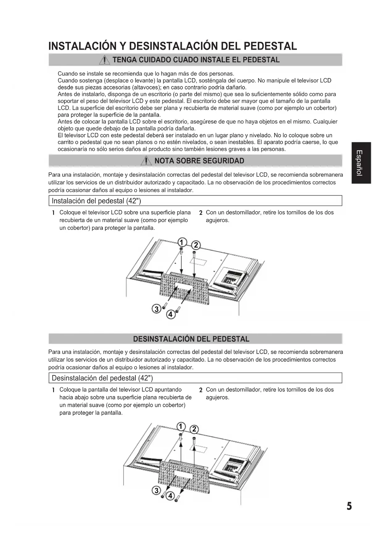Para una instalación, montaje y desinstalación correctas del pedestal del televisor LCD, se recomienda sobremanera utilizar los servicios de un distribuidor autorizado y capacitado. La no observación de los procedimientos correctos podría ocasionar daños al equipo o lesiones al instalador. Desinstalación del pedestal (42")