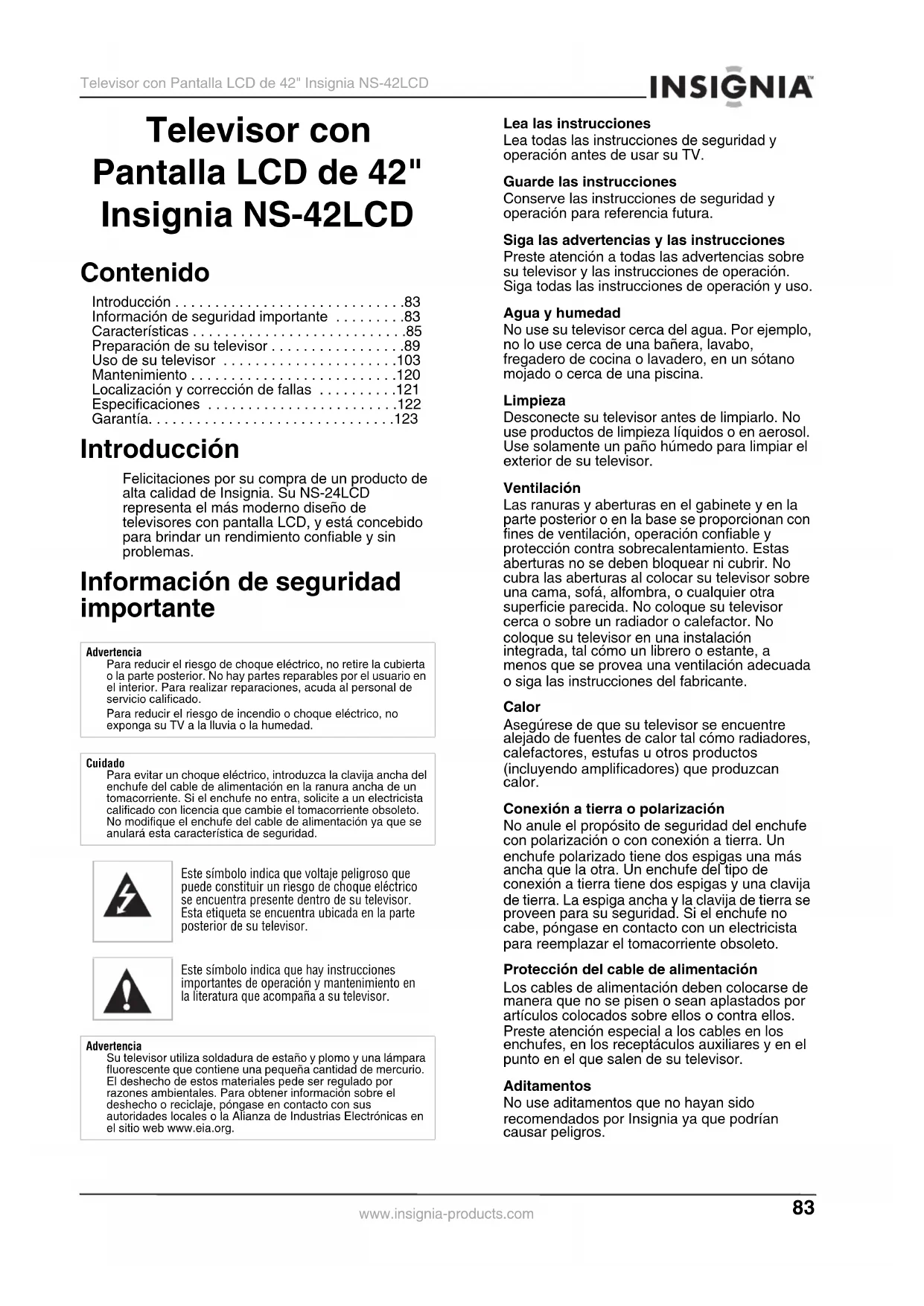 Rango de canales VHF: 2-13 UHF: 14-69 CATV: 1-125 CADTV: 1-135 DTV: 2-69 Sistema de TV NTSC-M, ATSC Accesorios Guía del usuario Control remoto Temperatura Almacenamiento: 32 ~ 122 °F (0 ~ 50 °C) Operación: 41 ~ 104 °F (5 °C a 40 °C)123 Televisor con Pantalla LCD de 42" Insignia NS-42LCD www.insignia-products.com Garantía Garantía limitada de un año Insignia Products (“Insignia”) le garantiza a usted, el comprador original de este nuevo NS-42LCD (“el Producto”), que éste se encontrará libre de defectos de material o de mano de obra en su fabricación original por un periodo de un (1) año a partir de la fecha de compra del Producto (“Período de Garantía”). Este producto debe ser comprado en un distribuidor autorizado de productos Insignia y empacado con esta declaración de garantía. Esta garantía no cubre Productos reacondicionados. Si notifica a Insignia durante el Período de Garantía sobre un defecto cubierto por esta garantía que requiere reparación, los términos de esta garantía se aplican. ¿Cuánto dura la garantía? El Período de Garantía dura por 1 año (365 días) a partir de la fecha en que compró el Producto. La fecha de compra se encuentra impresa en el recibo que recibió con el Producto. ¿Qué es lo que cubre esta garantía? Durante el Período de Garantía, si un centro de reparación autorizado de Insignia concluye que la fabricación original del material o la mano de obra del Producto se encuentran defectuosos Insignia (cómo su opción exclusiva): (1) reparará el Producto con repuestos nuevos o reacondicionados; o (2) reemplazará el Producto con uno nuevo o con uno reacondicionado con repuestos equivalentes. Los Productos y repuestos reemplazados bajo esta garantía se volverán propiedad de Insignia y no se le regresarán a usted. Si se requiere la reparación de Productos o partes después de que se vence el Período de Garantía, usted deberá pagar todos los costos de mano de obra y de repuestos. Esta garantía estará vigente con tal que usted sea el dueño de su producto Insignia durante el periodo de garantía. El alcance de la garantía se termina si usted vende o transfiere el producto. ¿Cómo se obtiene la reparación de garantía? Si ha comprado el Producto en una tienda de ventas, lleve su recibo original y el Producto a la tienda en donde lo compró. Asegúrese de que vuelva a colocar el Producto en su empaque original o en un empaque que provea la misma protección que el original. Si compró el Producto en un sitio Web, envíe por correo su recibo original y el Producto a la dirección postal listada en el sitio Web. Asegúrese de colocar el Producto en su empaque original o en un empaque que provea la misma protección que el original. ¿En dónde es válida la garantía? Esta garantía sólo es válida al comprador original del producto en los Estados Unidos y en Canadá. ¿Qué es lo que no cubre la garantía? Esta garantía no cubre:• Instrucción al cliente• Instalación• Ajuste de configuración• Daños cosméticos• Daños debido a actos de la naturaleza, tal cómo rayos• Accidentes• Mal uso•Abuso• Negligencia• Uso comercial• Modificación de alguna parte del Producto, incluyendo la antenaEsta garantía tampoco cubre:• Daño debido al uso o mantenimiento incorrecto• La conexión a una fuente de voltaje incorrecta• El intento de reparación por alguien que no sea una compañía autorizada por Insignia para reparar el Producto• Productos vendidos tal cual (en el estado en que se encuentran) o con todas sus fallas• Productos consumibles, tal cómo fusibles o baterías• Productos en los cuales el número de serie asignado en la fábrica ha sido alterado o removido.EL REEMPLAZO DE REPARACIÓN SEGÚN PROVISTO BAJO ESTA GARANTÍA ES SU ÚNICO RECURSO. INSIGNIA NO SERÁ RESPONSABLE POR DAÑOS INCIDENTALES O CONSECUENTES DEBIDO AL INCUMPLIMIENTO DE CUALQUIER GARANTÍA EXPRESA O IMPLÍCITA RELACIONADA CON ESTE PRODUCTO, INCLUYENDO PERO SIN LIMITARSE A LA PÉRDIDA DE INFORMACIÓN, LA PÉRDIDA DE NEGOCIOS O DE GANANCIAS. INSIGNIA PRODUCTS NO HACE NINGUNA OTRA GARANTÍA EXPRESA E IMPLÍCITA RELACIONADA A ESTE PRODUCTO, INCLUYENDO PERO SIN LIMITARSE A, CUALQUIER GARANTÍA IMPLICITA DE O CONDICIONES DE COMERCIALIZACIÓN O IDONEIDAD PARA UN USO PARTICULAR, ESTÁN LIMITADAS EN DURACIÓN AL PERÍODO DE GARANTÍA DECLARADO ANTERIORMENTE Y NINGUNA GARANTÍA YA SEA EXPRESA O IMPLÍCITA SE APLICARÁ DESPUÉS DEL PERÍODO DE GARANTÍA. ALGUNOS ESTADOS, PROVINCIAS Y JURISDICCIONES NO PERMITEN RESTRICCIONES EN CUANTO A LA DURACIÓN DE UNA GARANTÍA IMPLÍCITA, ASÍ QUE LA RESTRICCIÓN ANTERIOR PUEDE NO APLICARSE EN SU CASO. ESTA GARANTÍA LE DA DERECHOS LEGALES ESPECÍFICOS, Y USTED PUEDE POSEER OTROS DERECHOS QUE VARÍAN DE ESTADO A ESTADO, O DE PROVINCIA A PROVINCIA. Derechos de reproducción © 2006 Insignia. Insignia y el logotipo de Insignia son marcas de comercio de Best Buy Enterprise Services, Inc. Otras marcas y nombres de productos son marcas comerciales o marcas registradas de sus dueños respectivos. Las especificaciones y características están sujetas a cambio sin aviso previo u obligación.Para reparación y soporte llamar al (877) 467-4289.124 Televisor con Pantalla LCD de 42" Insignia NS-42LCD www.insignia-products.com