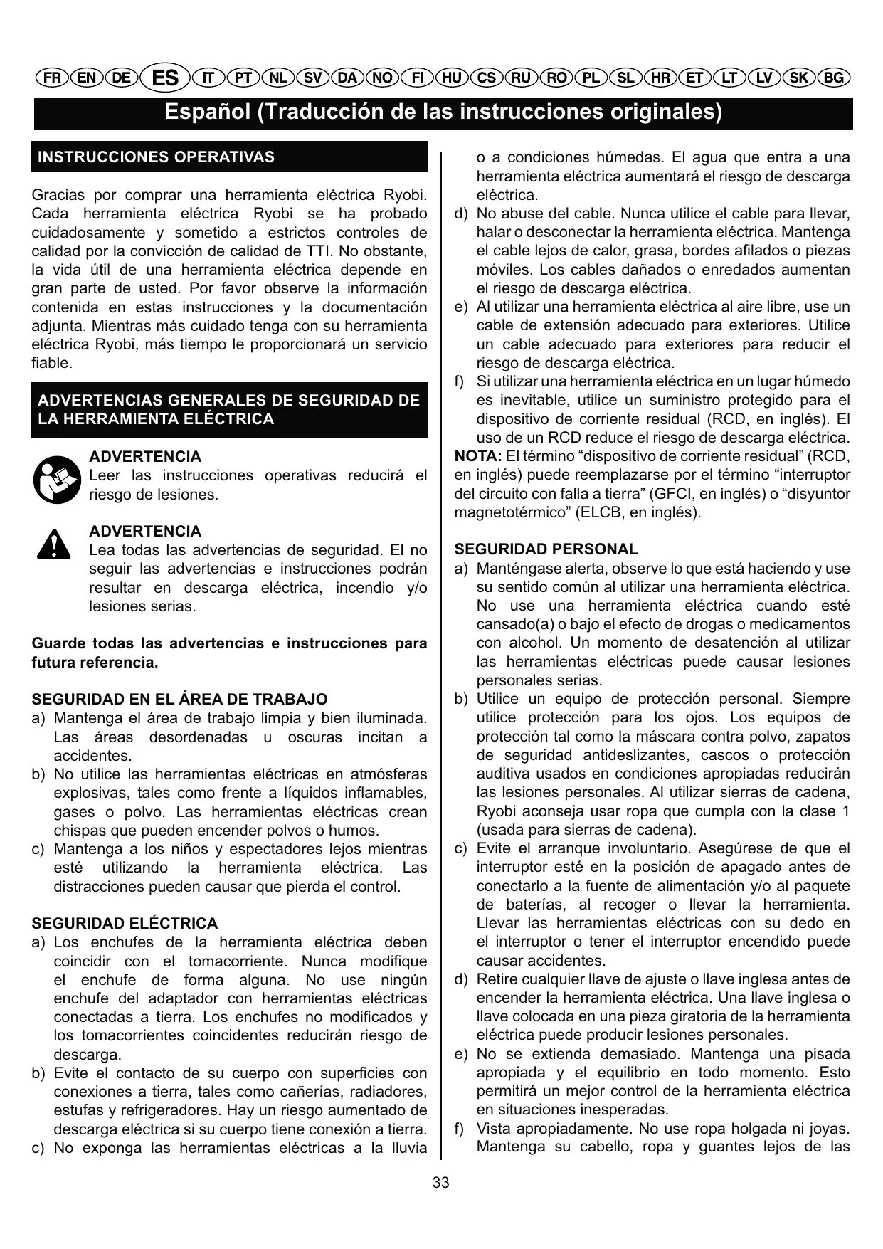 ADVERTENCIA Leer las instrucciones operativas reducirá el riesgo de lesiones. ADVERTENCIA Lea todas las advertencias de seguridad. El no seguir las advertencias e instrucciones podrán resultar en descarga eléctrica, incendio y/o lesiones serias. SEGURIDAD PERSONAL a) Manténgase alerta, observe lo que está haciendo y use su sentido común al utilizar una herramienta eléctrica. No use una herramienta eléctrica cuando esté cansado(a) o bajo el efecto de drogas o medicamentos con alcohol. Un momento de desatención al utilizar las herramientas eléctricas puede causar lesiones personales serias. b) Utilice un equipo de protección personal. Siempre utilice protección para los ojos. Los equipos de protección tal como la máscara contra polvo, zapatos de seguridad antideslizantes, cascos o protección auditiva usados en condiciones apropiadas reducirán las lesiones personales. Al utilizar sierras de cadena, Ryobi aconseja usar ropa que cumpla con la clase 1 (usada para sierras de cadena). c) Evite el arranque involuntario. Asegúrese de que el interruptor esté en la posición de apagado antes de conectarlo a la fuente de alimentación y/o al paquete de baterías, al recoger o llevar la herramienta. Llevar las herramientas eléctricas con su dedo en el interruptor o tener el interruptor encendido puede causar accidentes. d) Retire cualquier llave de ajuste o llave inglesa antes de encender la herramienta eléctrica. Una llave inglesa o llave colocada en una pieza giratoria de la herramienta eléctrica puede producir lesiones personales. e) No se extienda demasiado. Mantenga una pisada apropiada y el equilibrio en todo momento. Esto permitirá un mejor control de la herramienta eléctrica en situaciones inesperadas. f) Vista apropiadamente. No use ropa holgada ni joyas. Mantenga su cabello, ropa y guantes lejos de las Guarde todas las advertencias e instrucciones para futura referencia.