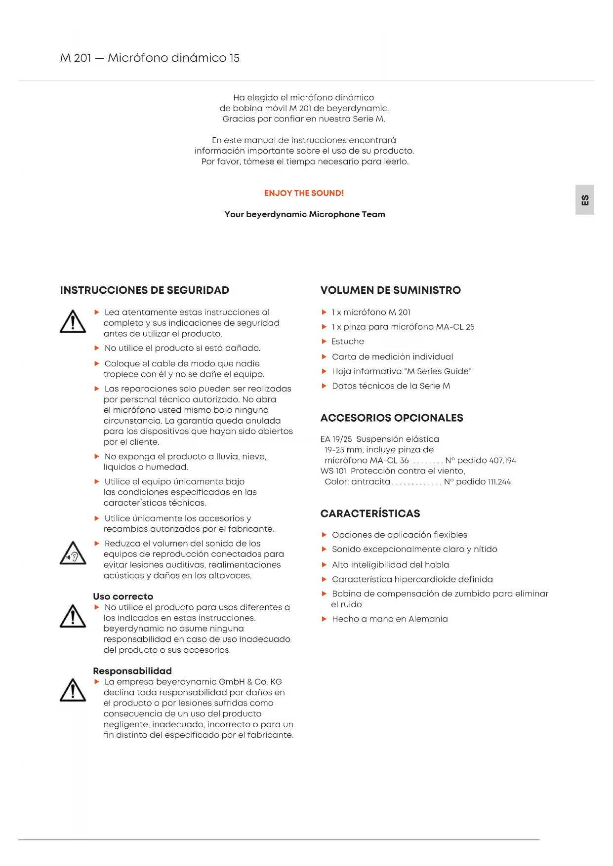 Ha elegido el micrófono dinámico de bobina móvil M 201 de beyerdynamic. Gracias por confiar en nuera Serie M. En ee manual de inrucciones encontrará información impoante sobre el uso de su producto. Por favor, tómese el tiempo necesario para leerlo. ENJOY THE SOUND! Your beyerdynamic Microphone Team