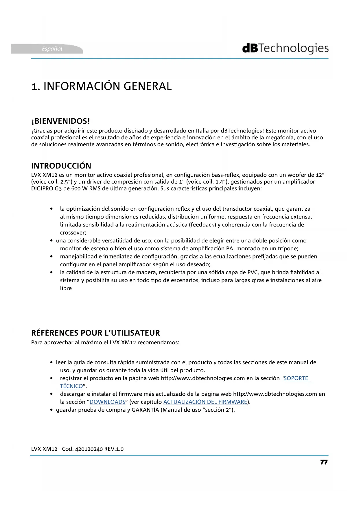 ¡Gracias por adquirir este producto diseñado y desarrollado en Italia por dBTechnologies! Este monitor activo coaxial profesional es el resultado de años de experiencia e innovación en el ámbito de la megafonía, con el uso de soluciones realmente avanzadas en términos de sonido, electrónica e investigación sobre los materiales. LVX XM12 es un monitor activo coaxial profesional, en conguración bass-reex, equipado con un woofer de 12” (voice coil: 2.5”) y un driver de compresión con salida de 1” (voice coil: 1.4”), gestionados por un amplicador DIGIPRO G3 de 600 W RMS de última generación. Sus características principales incluyen: Para aprovechar al máximo el LVX XM12 recomendamos: