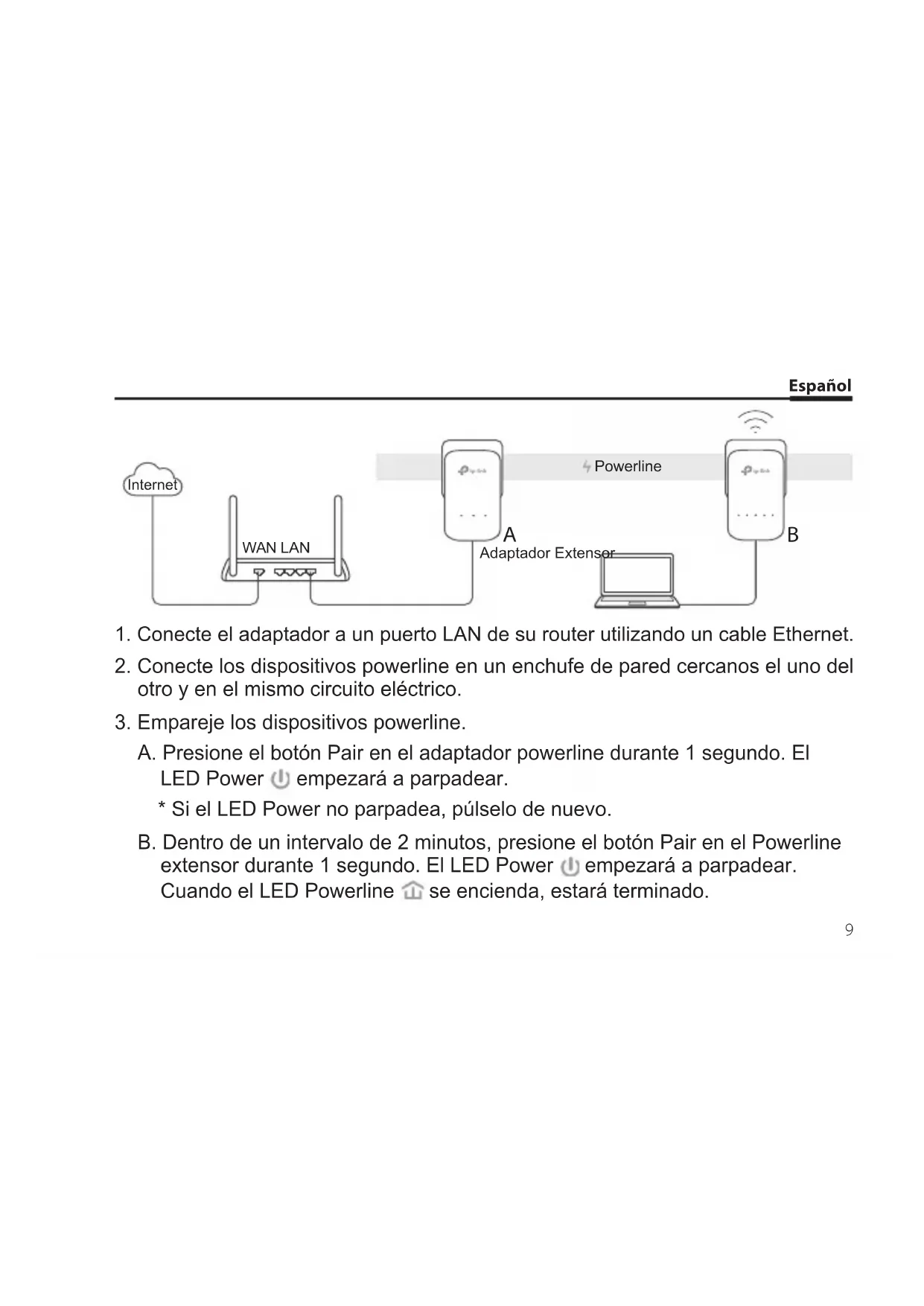 - Si el LED Power no parpadea, púlselo de nuevo. B. Dentro de un intervalo de 2 minutos, presione el botón Pair en el Powerline extensor durante 1 segundo. El LED Power empezará a parpadear. Cuando el LED Powerline se encienda, estará terminado. Internet WAN LAN Adaptador Extensor PowerlineEspañol