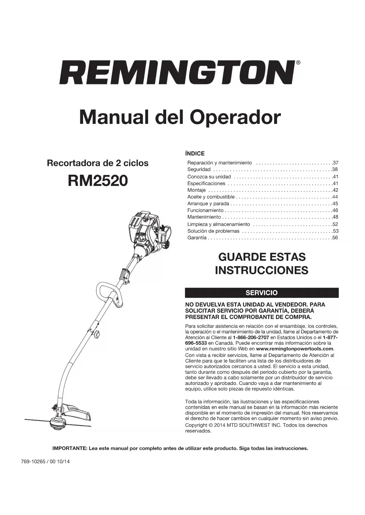 AL MOTOR LE FALTA POTENCIA O SE PARA EL CABEZAL DE CORTE NO HACE AVANZAR EL HILO EL HILO DE CORTE AVANZA SIN CONTROL54 NOTAS55 NOTASRemington LLC concede la garantía limitada establecida debajo para mercancías nuevas que sean compradas y usadas en los Estados Unidos, sus posesiones y territorios. Remington LLC garantiza este producto contra defectos en el material y la mano de obra durante un período de dos (2) años, a partir de la fecha de compra original y a su entera discreción, arreglará o substituirá sin costo alguno cualquier pieza cuyo material o mano de obra se considere defectuoso. Esta garantía limitada se deberá aplicar únicamente si este producto ha sido manejado y mantenido de acuerdo al Manual del Operario incluido con el producto y, si no ha sido sometido a mal uso, abuso, uso comercial, negligencia, accidente, mantenimiento inapropiado, alteración, vandalismo, hurto, fuego, agua o daños debidos a otros riesgos o desastre natural. Los daños ocasionados por la instalación o el uso de cualquier accesorio o aditamento que no esté aprobado por Remington y que sea usado con el (los) producto(s) contemplados en este manual, anularán la garantía con respecto a cualquier daño resultante. Esta garantía está limitada a noventa (90) días a partir de la fecha de compra original al detalle de cualquier producto Remington que se use para alquiler, para propósitos comerciales o cualquier otro propósito que genere ingresos. CÓMO OBTENER SERVICIO: El servicio de garantía está disponible A TRAVÉS DE SU DISTRIBUIDOR DE SERVICIO LOCAL AUTORIZADO, AL PRESENTAR EL COMPROBANTE DE COMPRA. Para localizar al distribuidor en su área, visite nuestro sitio en Internet en www.remingtonpowertools.com, busque el aviso clasificado en las Páginas Amarillas, llame al 1-866-206-2707 en EE.UU. o al 1-877-696-5533 en Canada, o escriba a Remington LLC, PO Box 361032, Cleveland, OH 44136. No se aceptará ningún producto que sea enviado directamente a la fábrica, a menos que haya recibido autorización previa por escrito por parte del Departamento de Servicio al Consumidor de Remington. Esta garantía limitada no ofrece cobertura en los siguientes casos: A. Sincronizaciones - bujías, ajustes de carburadores, filtros. B. Artículos de desgaste – Perillas de impacto, bobinas exteriores, hilo de corte, carretes interiores, polea de arranque, cuerdas de arranque, correas de transmisión, motosierras, barras de guía, dientes de la cultivadora, cuchillas. C. Remington no le ofrece ninguna garantía a los productos que sean vendidos o exportados fuera de los Estados Unidos de América, sus posesiones y territorios, excepto aquellos que se vendan a través de los canales de distribución para exportación autorizados por Remington. Remington se reserva el derecho a cambiar o mejorar el diseño de cualquier producto Remington, sin adoptar ninguna obligación para modificar cualquier producto fabricado con anterioridad. Ninguna garantía implícita es aplicable después del período de aplicabilidad de la garantía expresa escrita con anterioridad, incluyendo cualquier garantía implícita de comerciabilidad o idoneidad para un propósito particular con respecto a las piezas identificadas. Exceptuando lo mencionado anteriormente, ninguna otra garantía expresa bien sea escrita o verbal con respecto a cualquier producto que sea concedida por cualquier persona o entidad, incluyendo al distribuidor o minorista, deberá comprometer a Remington LLC durante el período de la Garantía, el remedio exclusivo es el arreglo o la sustitución del producto según lo establecido anteriormente. (Algunos estados no permiten limitaciones en cuanto al período de duración de una garantía implícita, de manera que puede que la limitación anterior no sea aplicable en su caso.) Las estipulaciones establecidas en esta Garantía ofrecen la solución única y exclusiva que resulte de las ventas. Remington no deberá ser responsable de pérdidas o daños incidentales o consecuentes que incluyan, sin limitación, gastos incurridos debido a la sustitución de servicios de mantenimiento de prados, transporte o gastos relacionados, o gastos de alquiler para reemplazar temporalmente un producto bajo garantía. (Algunos estados no permiten limitaciones en cuanto al período de duración de una garantía implícita, de manera que puede que la limitación anterior no sea aplicable en su caso.) Ningún tipo de recuperación deberá ser superior al precio de compra del producto vendido, en ningún caso. La alteración de las características de seguridad del producto deberá anular esta Garantía. Usted adopta el riesgo y la obligación de la pérdida, daño o lesión en su persona o a su propiedad y/o la de otras personas y sus propiedades, que se origine a raíz del uso o mal uso, o la incompetencia para usar el producto. Esta garantía limitada no deberá cubrir a ninguna otra persona distinta al comprador original, arrendatario original, o la persona para la cual se compró en calidad de regalo. Relación de las leyes estatales con esta Garantía: Esta garantía le confiere derechos legales específicos, y puede que usted también tenga otros derechos, los cuales varían en cada estado. Para localizar al distribuidor de servicio local más cercano, marque el número 1-866-206-2707 en EE.UU. o al 1-877-696-5533 en Canada. REMINGTON LLC P.O. Box 361032 Cleveland, OH 44136 GARANTÍA LIMITADA DEL FABRICANTE PARA: