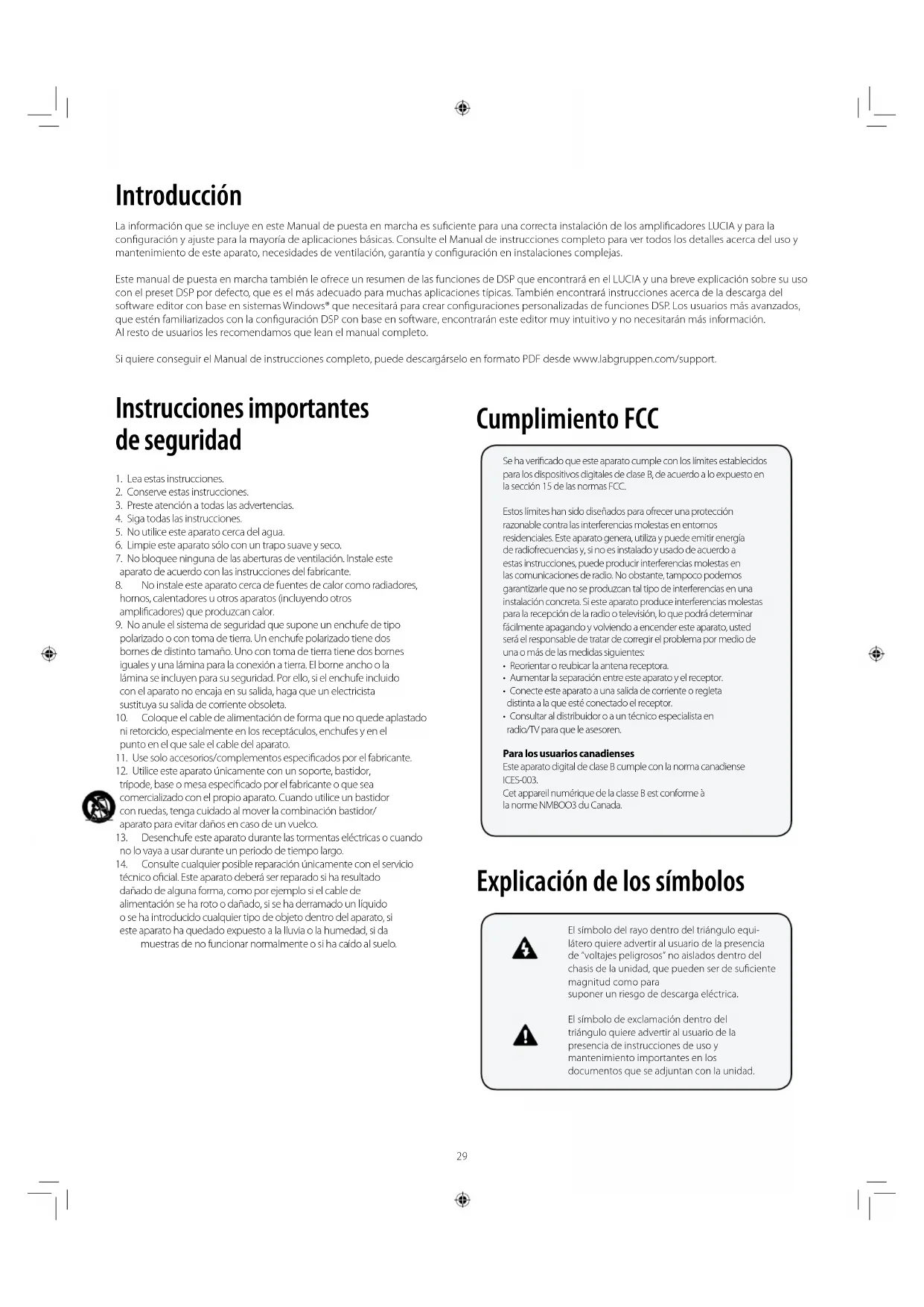 técnico oficial. Este aparato deberá ser reparado si ha resultado dañado de alguna forma, como por ejemplo si el cable de alimentación se ha roto o dañado, si se ha derramado un líquido o se ha introducido cualquier tipo de objeto dentro del aparato, si este aparato ha quedado expuesto a la lluvia o la humedad, si da muestras de no funcionar normalmente o si ha caído al suelo. Cumplimiento FCC Explicación de los símbolos Introducción La información que se incluye en este Manual de puesta en marcha es suficiente para una correcta instalación de los amplificadores LUCIA y para la configuración y ajuste para la mayoría de aplicaciones básicas. Consulte el Manual de instrucciones completo para ver todos los detalles acerca del uso y mantenimiento de este aparato, necesidades de ventilación, garantía y configuración en instalaciones complejas. Este manual de puesta en marcha también le ofrece un resumen de las funciones de DSP que encontrará en el LUCIA y una breve explicación sobre su uso con el preset DSP por defecto, que es el más adecuado para muchas aplicaciones típicas. También encontrará instrucciones acerca de la descarga del software editor con base en sistemas Windows® que necesitará para crear configuraciones personalizadas de funciones DSP. Los usuarios más avanzados, que estén familiarizados con la configuración DSP con base en software, encontrarán este editor muy intuitivo y no necesitarán más información. Al resto de usuarios les recomendamos que lean el manual completo. Si quiere conseguir el Manual de instrucciones completo, puede descargárselo en formato PDF desde www.labgruppen.com/support. El símbolo del rayo dentro del triángulo equi- látero quiere advertir al usuario de la presencia de “voltajes peligrosos” no aislados dentro del chasis de la unidad, que pueden ser de suficiente magnitud como para suponer un riesgo de descarga eléctrica. El símbolo de exclamación dentro del triángulo quiere advertir al usuario de la presencia de instrucciones de uso y mantenimiento importantes en los documentos que se adjuntan con la unidad. Se ha verificado que este aparato cumple con los límites establecidos para los dispositivos digitales de clase B, de acuerdo a lo expuesto en la sección 15 de las normas FCC. Estos límites han sido diseñados para ofrecer una protección razonable contra las interferencias molestas en entornos residenciales. Este aparato genera, utiliza y puede emitir energía de radiofrecuencias y, si no es instalado y usado de acuerdo a estas instrucciones, puede producir interferencias molestas en las comunicaciones de radio. No obstante, tampoco podemos garantizarle que no se produzcan tal tipo de interferencias en una instalación concreta. Si este aparato produce interferencias molestas para la recepción de la radio o televisión, lo que podrá determinar fácilmente apagando y volviendo a encender este aparato, usted será el responsable de tratar de corregir el problema por medio de una o más de las medidas siguientes: