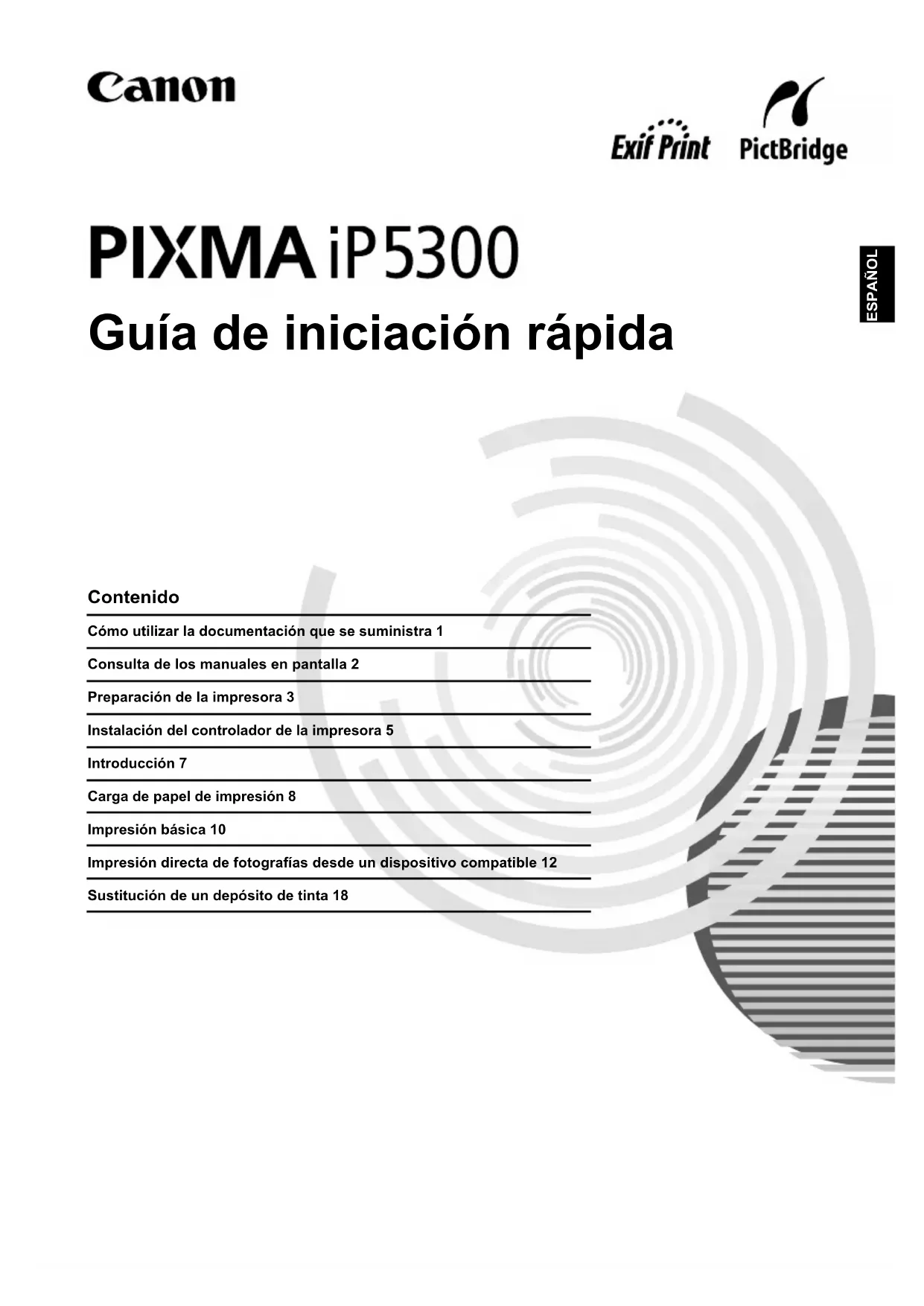 un programa mundial que fomenta el ahorro energético en el uso de equipos informáticos y de oficina. El programa respalda el desarrollo y la difusión de productos con funciones que reducen de forma eficaz el consumo energético. Es un sistema abierto en el que las empresas pueden participar voluntariamente. El programa va dirigido a productos de oficina como, por ejemplo, ordenadores, monitores, impresoras, faxes y fotocopiadoras. Sus estándares y logotipos son iguales para todos los países participantes. Requisitos de alimentación Utilice exclusivamente el suministro eléctrico del país de adquisición. El uso de un voltaje incorrecto podría provocar un incendio o una descarga eléctrica. El voltaje y la frecuencia correctos son: 100-240 V de CA, 50/60 Hz Acerca de los consumibles Los consumibles, como los depósitos de tinta y los cartuchos FINE (FINE Cartridges), estarán disponibles durante 5 años después de que finalice su fabricación. Precauciones de seguridad Número de modelo: K10285 (iP5300) Advertencia z Nunca intente conectar el cable de alimentación a la toma de corriente ni intente desconectar el cable de alimentación si tiene las manos húmedas. z No dañe, modifique, estire, retuerza o doble excesivamente el cable de alimentación eléctrica. No coloque objetos pesados sobre el cable. z No utilice un voltaje diferente al del país de compra. El uso de un voltaje y una frecuencia incorrectos podría provocar un incendio o una descarga eléctrica.z Introduzca el enchufe de la impresora en la toma de corriente hasta que haga tope. Precaución z Por razones de seguridad, almacene los depósitos de tinta fuera del alcance de los niños. z No deje caer ni agite los depósitos de tinta, ya que la tinta puede gotear y manchar la ropa y las manos. Lea también las Precauciones de seguridad del manual en pantalla Guía del Usuario. Tenga en cuenta los mensajes de advertencia y precaución con el fin de evitar daños tanto al usuario como a la impresora.1Cómo utilizar la documentación que se suministra ESPAÑOL Cómo utilizar la documentación que se suministra Instrucciones de instalación (página de instalación) Lea esta página primero. Esta página incluye instrucciones para instalar la impresora y prepararla para el uso. Guía de iniciación rápida (esta guía) Lea esta guía cuando vaya a utilizar la impresora. Después de seguir las instrucciones que se encuentran en Instrucciones de instalación (página de instalación), le recomendamos que lea esta guía para familiarizarse con el funcionamiento básico, por ejemplo, imprimir desde el equipo y un dispositivo compatible con PictBridge. Manuales en pantalla Guía del Usuario Lea esta guía cuando vaya a utilizar la impresora. Si la Guía de iniciación rápida no proporciona suficiente información, consulte la Guía del Usuario que se puede instalar desde el [Setup CD-ROM/CD-ROM de instalación]. Esta guía incluye instrucciones detalladas para: z imprimir desde el equipo z tipos de soporte compatibles z mantenimiento habitual z solución de problemas Existen guías adicionales a su disposición para las funciones avanzadas. Guía del controlador de la impresora Consulte esta guía para obtener instrucciones completas sobre la configuración del controlador de la impresora. [Photo Application Guide/Guía de las aplicaciones para fotografías] Consulte esta guía para obtener instrucciones acerca del uso de las diversas aplicaciones de software que se incluyen en el [Setup CD-ROM/CD-ROM de instalación].2 Consulta de los manuales en pantalla ESPAÑOL Consulta de los manuales en pantalla Junto con esta Guía de iniciación rápida, también se proporcionan con la impresora los manuales en pantalla. Para obtener instrucciones detalladas sobre la instalación de los manuales en pantalla, consulte las Instrucciones de instalación (página de instalación). Los manuales en pantalla se pueden ver del siguiente modo: Para ver el manual en pantalla, haga doble clic en el icono de acceso directo [iP5300 On-screen Manual/Manual en pantalla de iP5300] en el escritorio o haga clic en [Start/Inicio] > [All Programs/Todos los programas] (o [Programs/Programas]) > [Canon iP5300 Manual/ Manual de Canon iP5300] > [iP5300 On-screen Manual/Manual en pantalla de iP5300]. Requisitos del sistema Navegador: Visor de ayuda HTML de Windows Para ver el manual en pantalla, haga doble clic en el acceso [iP5300 On-screen Manual/Manual en pantalla de iP5300] del escritorio. Requisitos del sistema Navegador: Visor de ayuda Nota z Debe tener instalado Microsoft Internet Explorer