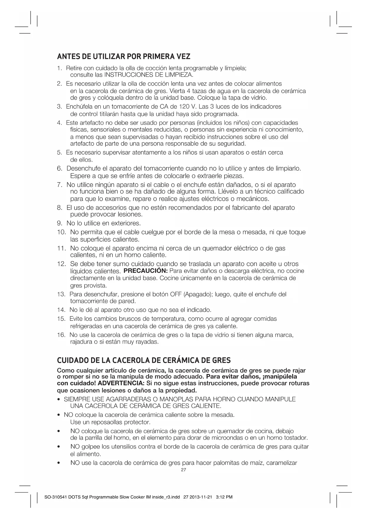 - NO use la cacerola de cerámica de gres para hacer palomitas de maíz, caramelizar SO-310541 DOTS 5qt Programmable Slow Cooker IM inside_r3.indd 27 2013-11-21 3:12 PM28 el azúcar o elaborar dulces.