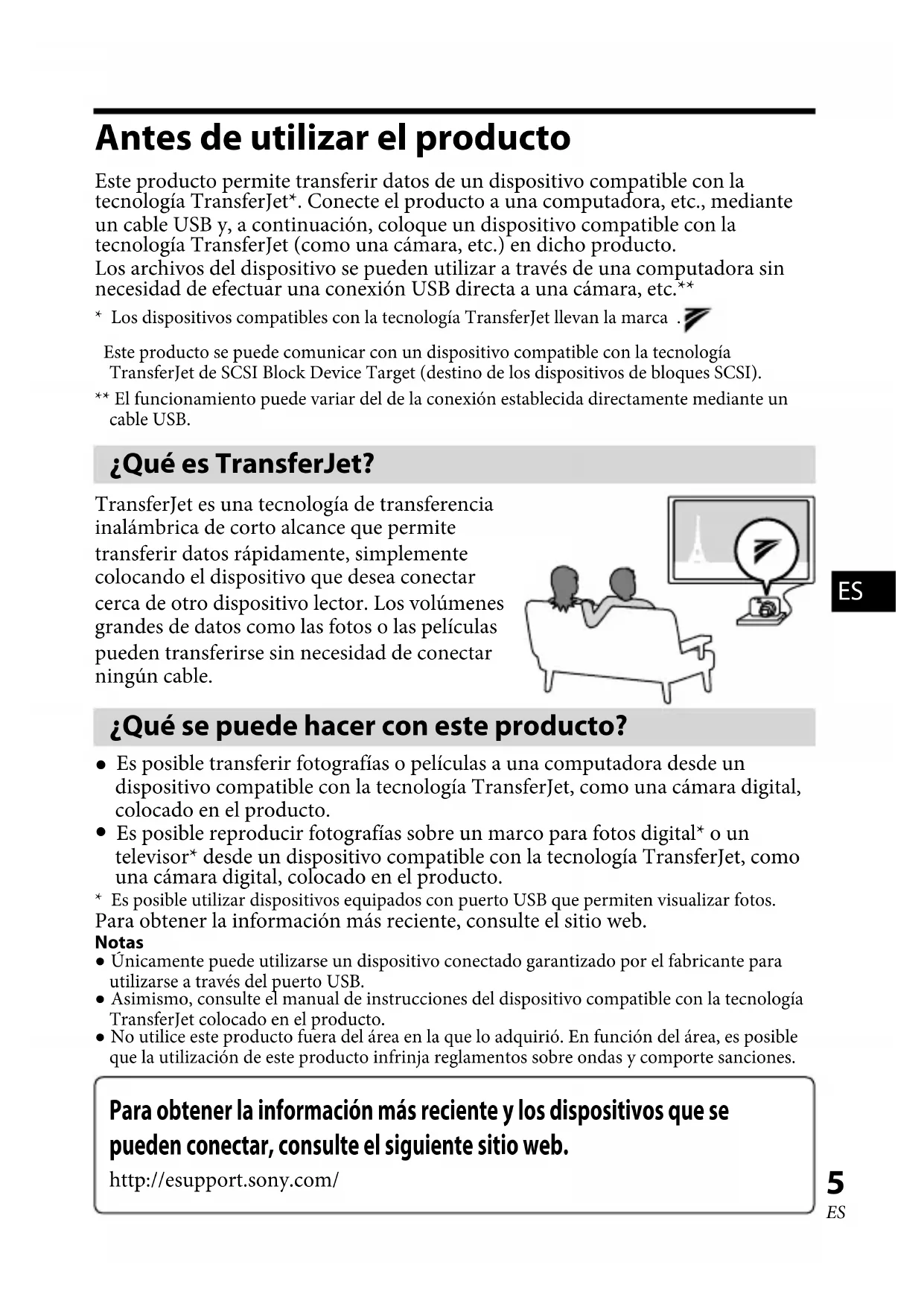 - Es posible utilizar dispositivos equipados con puerto USB que permiten visualizar fotos. Para obtener la información más reciente, consulte el sitio web. Notas Únicamente puede utilizarse un dispositivo conectado garantizado por el fabricante para utilizarse a través del puerto USB. Asimismo, consulte el manual de instrucciones del dispositivo compatible con la tecnología TransferJet colocado en el producto. No utilice este producto fuera del área en la que lo adquirió. En función del área, es posible que la utilización de este producto infrinja reglamentos sobre ondas y comporte sanciones. Para obtener la información más reciente y los dispositivos que se pueden conectar, consulte el siguiente sitio web. http://esupport.sony.com/6