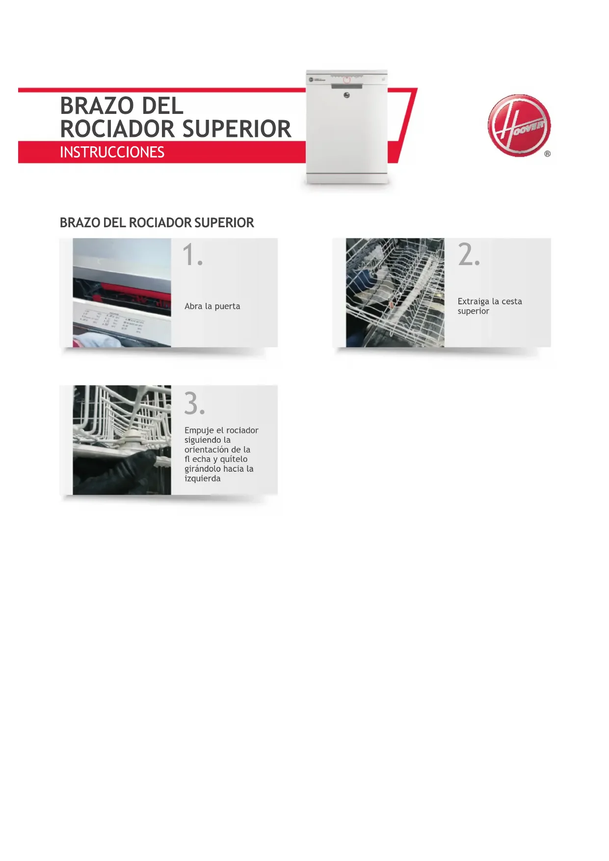 BRAZO DEL ROCIADOR SUPERIORINSTRUCCIONES Abra la puerta Extraiga la cesta inferior