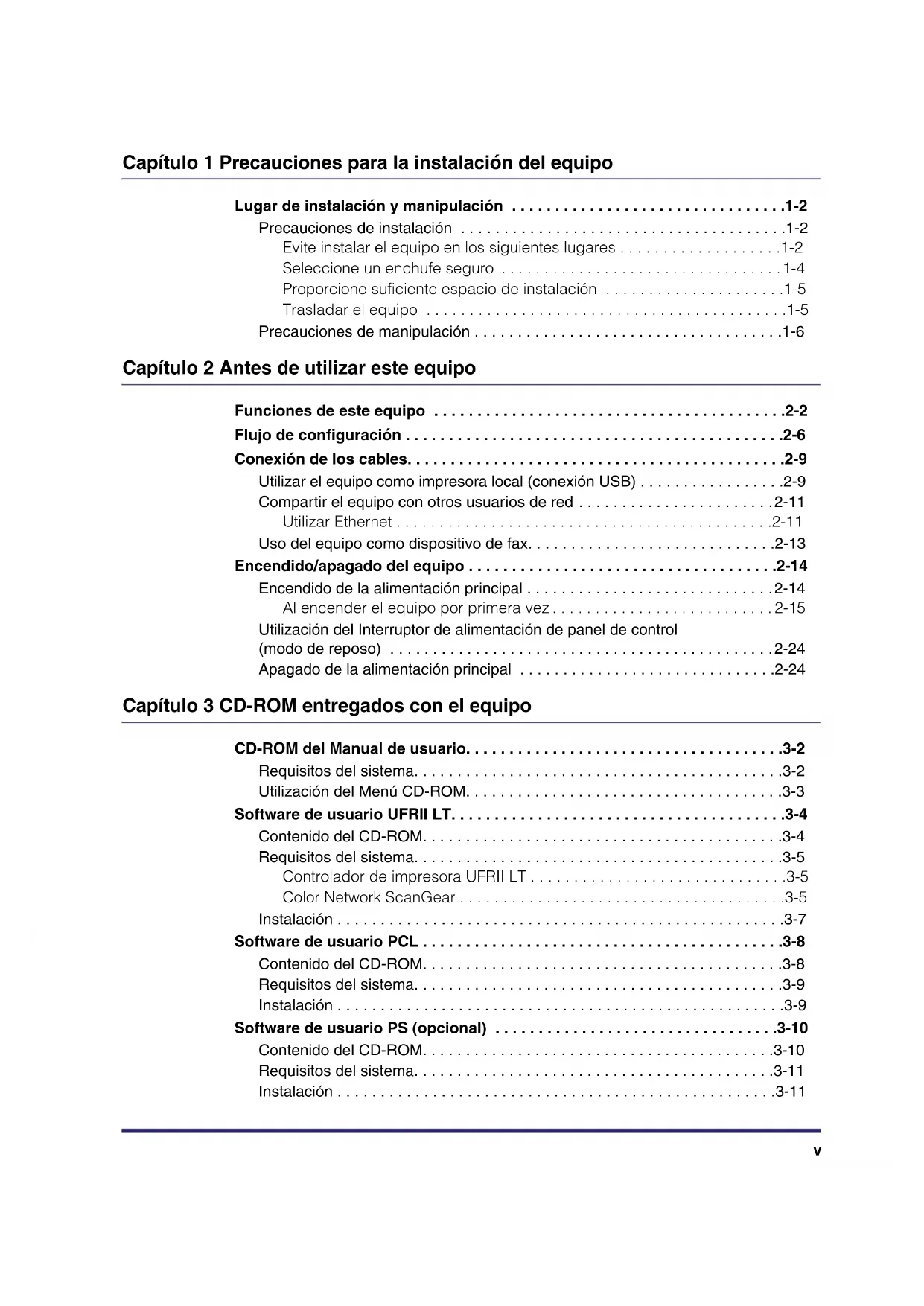 - Instrucciones del controlador de fax de Windows Guía del controlador de fax de Windows CD-ROM Para ver el manual en formato PDF, se necesita Adobe Reader/Adobe Acrobat Reader. Si no está instalado Adobe Reader/Adobe Acrobat Reader en su sistema, puede descargarlo del sitio web de Adobe Systems Incorporated.Organización de este manual Precauciones para la instalación del equipo Antes de utilizar este equipo CD-ROM entregados con el equipo Mantenimiento periódico Solución de problemas Apéndice Incluye las descripciones del papel disponible y del Índice. Capítulo 1 Capítulo 2 Capítulo 3 Capítulo 4 Capítulo 5 Capítulo 6 Se ha hecho un gran esfuerzo para evitar inexactitudes y omisiones en este manual. No obstante, debido al continuo perfeccionamiento de nuestros productos, consulte a Canon si necesita una especificación exacta.iv Índice Prefacio. . . . . . . . . . . . . . . . . . . . . . . . . . . . . . . . . . . . . . . . . . . . . . . . . . . . . . . . . vii Cómo utilizar este manual . . . . . . . . . . . . . . . . . . . . . . . . . . . . . . . . . . . . . . . . . vii Símbolos utilizadas en este manual. . . . . . . . . . . . . . . . . . . . . . . . . . . . . . . . . vii Teclas y botones utilizadas en este manual. . . . . . . . . . . . . . . . . . . . . . . . . . . viii Ilustraciones utilizadas en este manual . . . . . . . . . . . . . . . . . . . . . . . . . . . . . . viii Pantallas utilizadas en este manual. . . . . . . . . . . . . . . . . . . . . . . . . . . . . . . . . . ix Abreviaturas utilizadas en este manual . . . . . . . . . . . . . . . . . . . . . . . . . . . . . . . ix Marcas registradas. . . . . . . . . . . . . . . . . . . . . . . . . . . . . . . . . . . . . . . . . . . . . . . x Operaciones y términos utilizados en los manuales . . . . . . . . . . . . . . . . . . . . . x Funciones disponibles . . . . . . . . . . . . . . . . . . . . . . . . . . . . . . . . . . . . . . . . . . . xii Avisos legales . . . . . . . . . . . . . . . . . . . . . . . . . . . . . . . . . . . . . . . . . . . . . . . . . . .xiii Nombre del producto . . . . . . . . . . . . . . . . . . . . . . . . . . . . . . . . . . . . . . . . . . . . xiii Directiva de la CE sobre compatibilidad electromagnética . . . . . . . . . . . . . . . xiii Directiva R & TTE. . . . . . . . . . . . . . . . . . . . . . . . . . . . . . . . . . . . . . . . . . . . . . . xiii Seguridad láser . . . . . . . . . . . . . . . . . . . . . . . . . . . . . . . . . . . . . . . . . . . . . . . . xiii Información adicional . . . . . . . . . . . . . . . . . . . . . . . . . . . . . . . . . . . . . . . . . . . . xiv Programa internacional ENERGY STAR . . . . . . . . . . . . . . . . . . . . . . . . . . . . . xv Logotipo IPv6 Ready . . . . . . . . . . . . . . . . . . . . . . . . . . . . . . . . . . . . . . . . . . . . xv Directiva WEEE . . . . . . . . . . . . . . . . . . . . . . . . . . . . . . . . . . . . . . . . . . . . . . . . xvi Marcas comerciales . . . . . . . . . . . . . . . . . . . . . . . . . . . . . . . . . . . . . . . . . . . . .xvii Software de terceros . . . . . . . . . . . . . . . . . . . . . . . . . . . . . . . . . . . . . . . . . . . .xvii Descargo de responsabilidad. . . . . . . . . . . . . . . . . . . . . . . . . . . . . . . . . . . . . xviii Limitaciones legales al empleo de su equipo y al uso de imágenes . . . . . . . xviii Súper G3 . . . . . . . . . . . . . . . . . . . . . . . . . . . . . . . . . . . . . . . . . . . . . . . . . . . . . xix Instrucciones importantes de seguridad . . . . . . . . . . . . . . . . . . . . . . . . . . . . . xx Instalación . . . . . . . . . . . . . . . . . . . . . . . . . . . . . . . . . . . . . . . . . . . . . . . . . . . . xx Alimentación eléctrica . . . . . . . . . . . . . . . . . . . . . . . . . . . . . . . . . . . . . . . . . . . xxi Manipulación . . . . . . . . . . . . . . . . . . . . . . . . . . . . . . . . . . . . . . . . . . . . . . . . . .xxii Mantenimiento e inspecciones. . . . . . . . . . . . . . . . . . . . . . . . . . . . . . . . . . . . xxv Consumibles. . . . . . . . . . . . . . . . . . . . . . . . . . . . . . . . . . . . . . . . . . . . . . . . . .xxvii Otras advertencias . . . . . . . . . . . . . . . . . . . . . . . . . . . . . . . . . . . . . . . . . . . . .xxviiv Capítulo 1 Precauciones para la instalación del equipo Lugar de instalación y manipulación . . . . . . . . . . . . . . . . . . . . . . . . . . . . . . . .1-2 Precauciones de instalación . . . . . . . . . . . . . . . . . . . . . . . . . . . . . . . . . . . . . .1-2 Evite instalar el equipo en los siguientes lugares . . . . . . . . . . . . . . . . . . .1-2 Seleccione un enchufe seguro . . . . . . . . . . . . . . . . . . . . . . . . . . . . . . . . .1-4 Proporcione suficiente espacio de instalación . . . . . . . . . . . . . . . . . . . . .1-5 Trasladar el equipo . . . . . . . . . . . . . . . . . . . . . . . . . . . . . . . . . . . . . . . . . .1-5 Precauciones de manipulación . . . . . . . . . . . . . . . . . . . . . . . . . . . . . . . . . . . .1-6 Capítulo 2 Antes de utilizar este equipo Funciones de este equipo . . . . . . . . . . . . . . . . . . . . . . . . . . . . . . . . . . . . . . . . .2-2 Flujo de configuración . . . . . . . . . . . . . . . . . . . . . . . . . . . . . . . . . . . . . . . . . . . .2-6 Conexión de los cables. . . . . . . . . . . . . . . . . . . . . . . . . . . . . . . . . . . . . . . . . . . .2-9 Utilizar el equipo como impresora local (conexión USB) . . . . . . . . . . . . . . . . .2-9 Compartir el equipo con otros usuarios de red . . . . . . . . . . . . . . . . . . . . . . .2-11 Utilizar Ethernet . . . . . . . . . . . . . . . . . . . . . . . . . . . . . . . . . . . . . . . . . . . .2-11 Uso del equipo como dispositivo de fax. . . . . . . . . . . . . . . . . . . . . . . . . . . . .2-13 Encendido/apagado del equipo . . . . . . . . . . . . . . . . . . . . . . . . . . . . . . . . . . . .2-14 Encendido de la alimentación principal . . . . . . . . . . . . . . . . . . . . . 