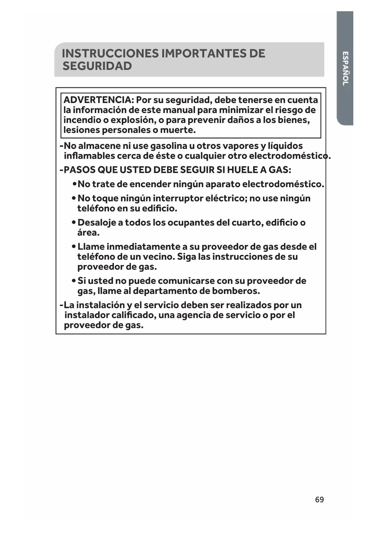 SEGURIDAD -No almacene ni use gasolina u otros vapores y líquidos inflamables cerca de éste o cualquier otro electrodoméstico. -PASOS QUE USTED DEBE SEGUIR SI HUELE A GAS: