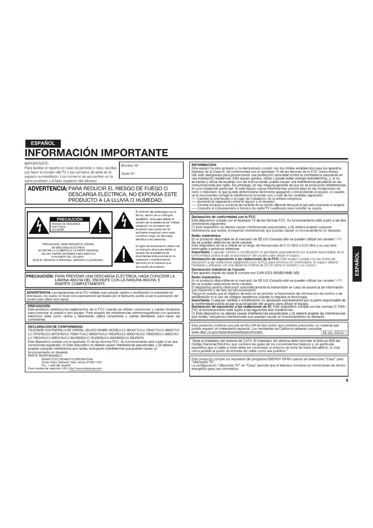 PRODUCTO A LA LLUVIA O HUMEDAD. ADVERTENCIA: PRECAUCIÓN: PARA REDUCIR EL RIESGO DE DESCARGA ELÉCTRICA, NO RETIRE LA CUBIERTA (O LA PARTE TRASERA).NO HAY PARTES INTERNAS PARA SERVICIO POR PARTE DEL USUARIO.DEJE EL SERVICIO A PERSONAL SERVICIO CUALIFICADO.PARA PREVENIR UNA DESCARGA ELÉCTRICA, HAGA COINCIDIR LA LÁMINA ANCHA DEL ENCHUFE CON LA RANURA ANCHA, E INSERTE COMPLETAMENTE. PRECAUCIÓN: ADVERTENCIA: Las regulaciones de la FCC señalan que cualquier cambio o modificación no autorizado en este equipo, los cuales no hayan sido expresamente aprobados por el fabricante, podría anular la autorización del usuario para utilizar este equipo. DECLARACIÓN DE CONFORMIDAD: TELEVISOR CON PANTALLA DE CRISTAL LÍQUIDO SHARP, MODELO LC-80UQ17U/LC-70UQ17U/LC-60UQ17U/ LC-70TQ15U/LC-60TQ15U/LC-70SQ17U/LC-60SQ17U/LC-70SQ15U/LC-60SQ15U/LC-70SQ10U/LC-60SQ10U/ LC-70EQ10U/LC-60EQ10U/LC-80LE650U/LC-70LE650U/LC-60LE650U/LC-90LE657U Este dispositivo cumple con el Apartado 15 de las Normas FCC. Su funcionamiento está sujeto a las dos condiciones siguientes: (1) Este dispositivo no deberá causar interferencias perjudiciales, y (2) deberá aceptar cualquier interferencia que reciba, incluyendo interferencias que puedan causar un funcionamiento no deseado. PARTE RESPONSABLE: SHARP ELECTRONICS CORPORATIONSharp Plaza, Mahwah, New Jersey 07495-1163TEL: 1-800-BE-SHARPPara clientes de negocios: URL http://www.sharpusa.com PRECAUCIÓN: Este producto satisface los reglamentos de la FCC cuando se utilizan conectores y cables blindados para conectar la unidad a otro equipo. Para impedir las interferencias electromagnéticas con aparatos eléctricos tales como radios y televisores, utilice conectores y cables blindados para hacer las conexiones.