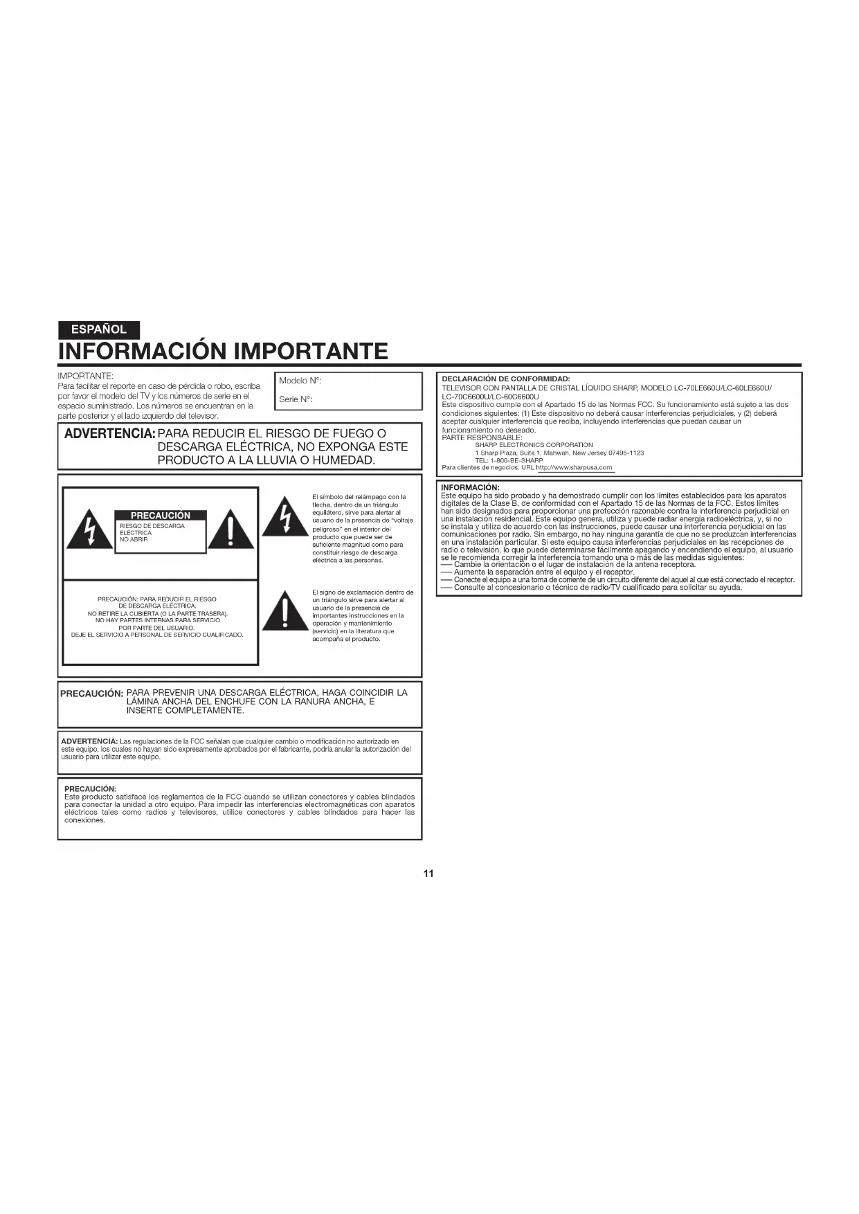 Consulte al concesionario o técnico de radio/TV cualifi cado para solicitar su ayuda. DECLARACIÓN DE CONFORMIDAD: TELEVISOR CON PANTALLA DE CRISTAL LÍQUIDO SHARP, MODELO LC-70LE660U/LC-60LE660U/ LC-70C6600U/LC-60C6600U Este dispositivo cumple con el Apartado 15 de las Normas FCC. Su funcionamiento está sujeto a las dos condiciones siguientes: (1) Este dispositivo no deberá causar interferencias perjudiciales, y (2) deberá aceptar cualquier interferencia que reciba, incluyendo interferencias que puedan causar un funcionamiento no deseado. PARTE RESPONSABLE: