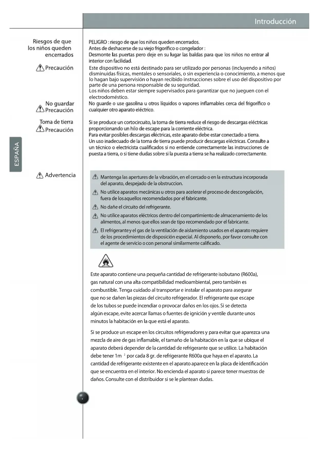 ESPAÑA /Miracle Zone /Miracle Zone /Miracle Zone ESPAÑA. Este dispositivo no está destinado para ser utilizado por personas (incluyendo a niños) disminuidas físicas, mentales o sensoriales, o sin experiencia o conocimiento, a menos que lo hagan bajo supervisión o hayan recibido instrucciones sobre el uso del dispositivo por parte de una persona responsable de su seguridad.Los niños deben estar siempre supervisados para garantizar que no jueguen con el electrodoméstico. Este aparato contiene una pequeña cantidad de refrigerante isobutano (R600a), gas natural con una alta compatibilidad medioambiental, pero también es combustible. Tenga cuidado al transportar e instalar el aparato para asegurar que no se dañen las piezas del circuito refrigerador. El refrigerante que es cape de los tubos se puede incendiar o provocar daños en los ojos. Si se detecta algún escape, evite acercar llamas o fuentes de ignición y ventile durante unos minutos la habitación en la que está el aparato. Si se produce un escape en los circuitos refrigeradores y para evitar que aparezca una mezcla de aire de gas inamable, el tamaño de la habitación en la que se ubique el aparato deberá depender de la cantidad de refrigerante que se utilice. La habitación debe tener 1m