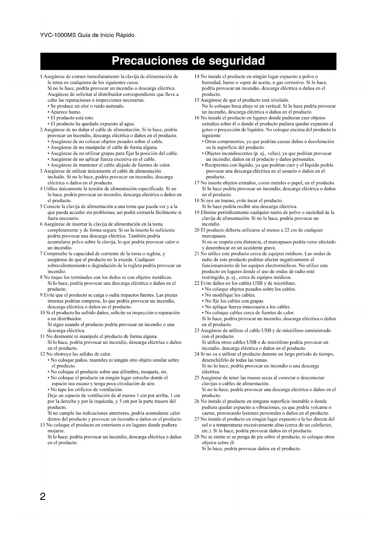 - No coloque cables cerca de fuentes de calor. Si lo hace, podría provocar un incendio, descarga eléctrica o daños en el producto. 23 Asegúrese de utilizar el cable USB y de micrófono suministrado con el producto. Si utiliza otros cables USB o de micrófono podría provocar un incendio, descarga eléctrica o daños en el producto. 24 Si no va a utilizar el producto durante un largo periodo de tiempo, desenchúfelo de todas las tomas. Si no lo hace, podría provocar un incendio o una descarga eléctrica. 25 Asegúrese de tener las manos secas al conectar o desconectar clavijas o cables de alimentación. Si no lo hace, podría provocar una descarga eléctrica o daños en el producto. 26 No instale el producto en ninguna superficie inestable o donde pudiera quedar expuesto a vibraciones, ya que podría volcarse o caerse, provocando lesiones personales o daños en el producto. 27 No instale el producto en ningún lugar expuesto a la luz directa del sol o a temperaturas excesivamente altas (cerca de un calefactor, etc.). Si lo hace, podría provocar daños en el producto. 28 No se siente ni se ponga de pie sobre el producto, ni coloque otros objetos sobre él. Si lo hace, podría provocar daños en el producto. Precauciones de seguridadYVC-1000MS Guía de Inicio Rápido