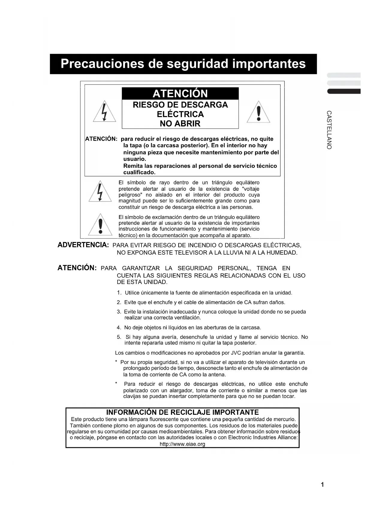 Precauciones de seguridad importantes CASTELLANO 1‧ Como socio de “ENERGY STAR ”, JVC ha determinado que este producto o modelo de producto cumple las directrices de “ENERGY STAR ” en lo que al rendimiento de energía se refiere.