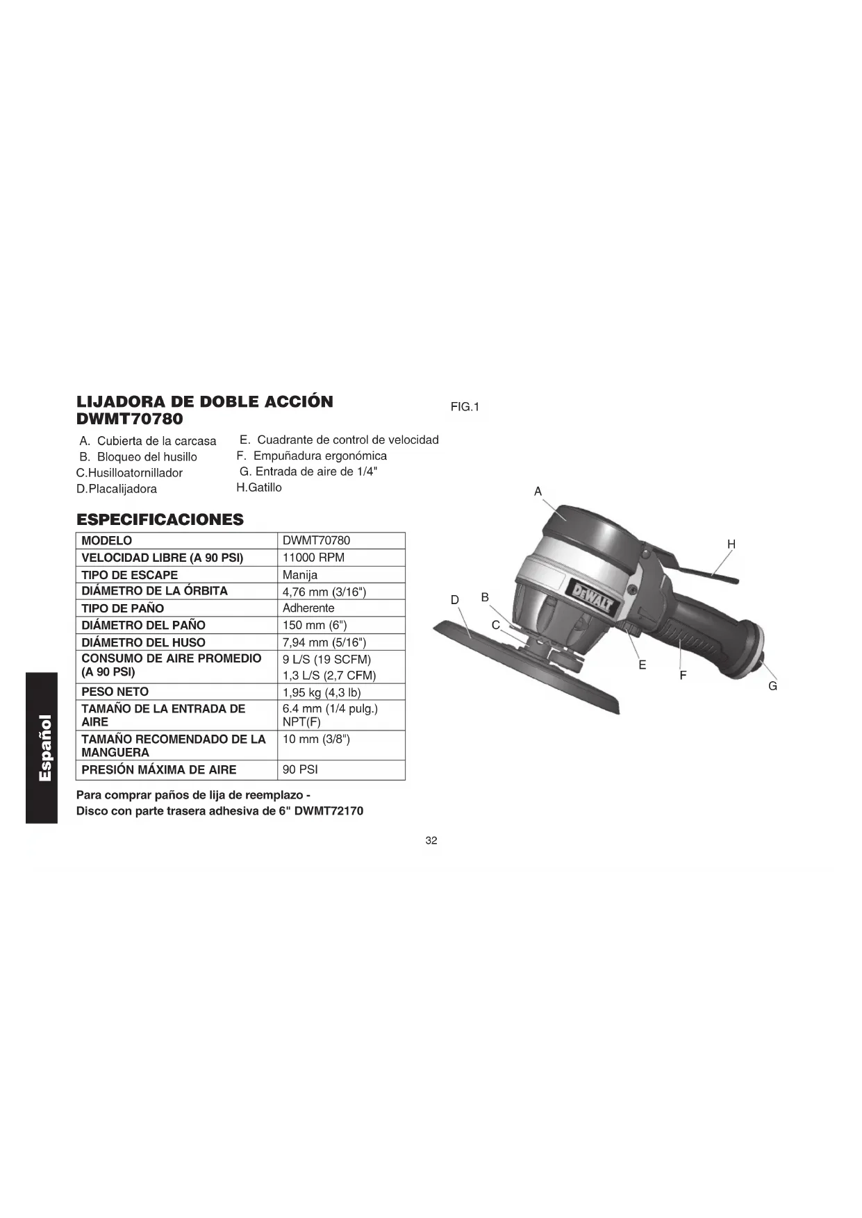 DWMT70780 A. Cubierta de la carcasa B. Bloqueo del husillo C. Husillo atornillador D. Placa lijadora E. Cuadrante de control de velocidad F. Empuñadura ergonómica G. Entrada de aire de 1/4" H. Gatillo ESPECIFICACIONES MODELO DWMT70780 VELOCIDAD LIBRE (A 90 PSI) 11000 RPM