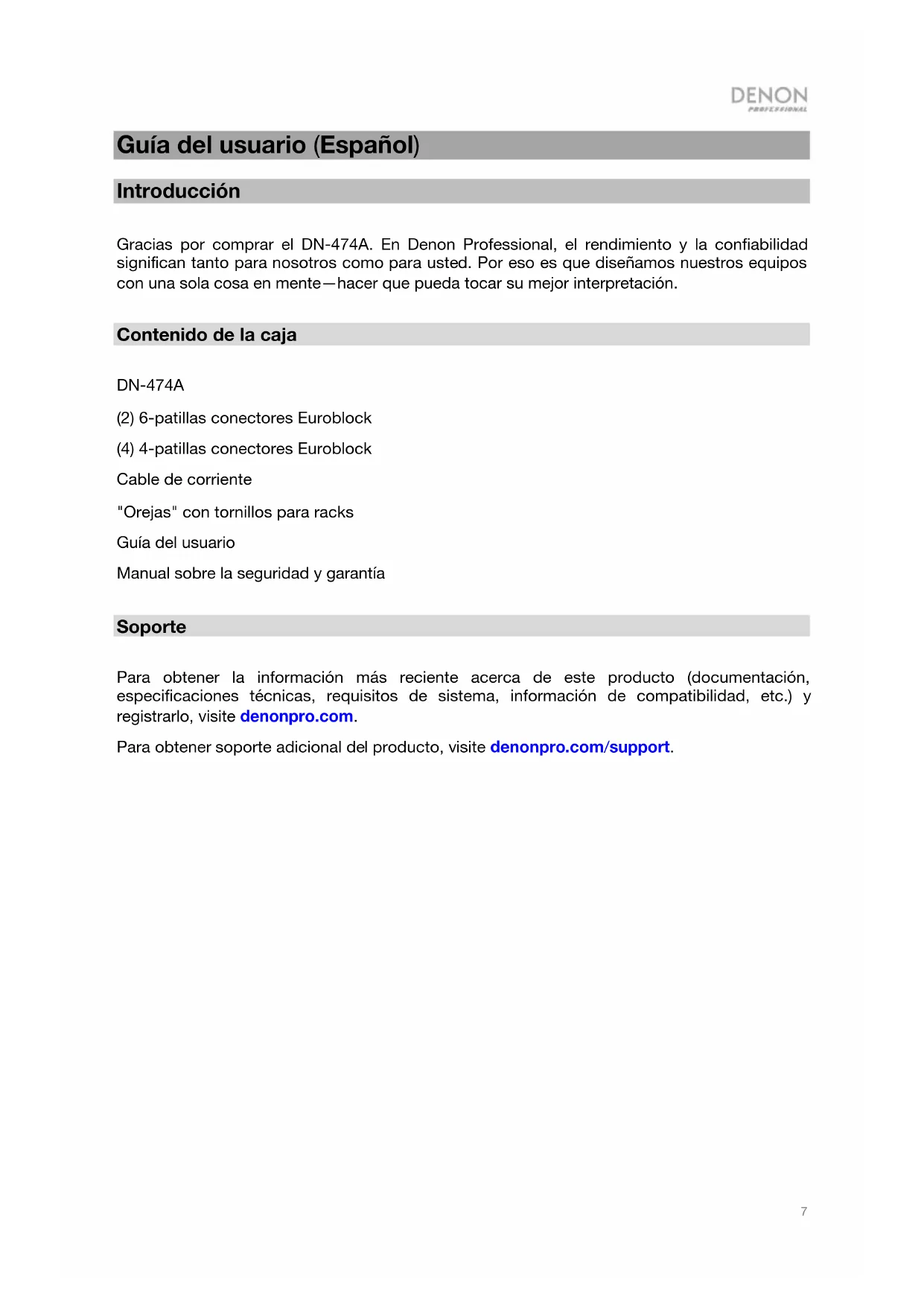 CH A CH B CH C CH D7 Guía del usuario (Español) Introducción Gracias por comprar el DN-474A. En Denon Professional, el rendimiento y la confiabilidad significan tanto para nosotros como para usted. Por eso es que diseñamos nuestros equipos con una sola cosa en mente—hacer que pueda tocar su mejor interpretación. Contenido de la caja DN-474A (2) 6-patillas conectores Euroblock (4) 4-patillas conectores Euroblock Cable de corriente "Orejas" con tornillos para racks Guía del usuario Manual sobre la seguridad y garantía Soporte Para obtener la información más reciente acerca de este producto (documentación, especificaciones técnicas, requisitos de sistema, información de compatibilidad, etc.) y registrarlo, visite denonpro.com. Para obtener soporte adicional del producto, visite denonpro.com/support.8 Características Panel frontal