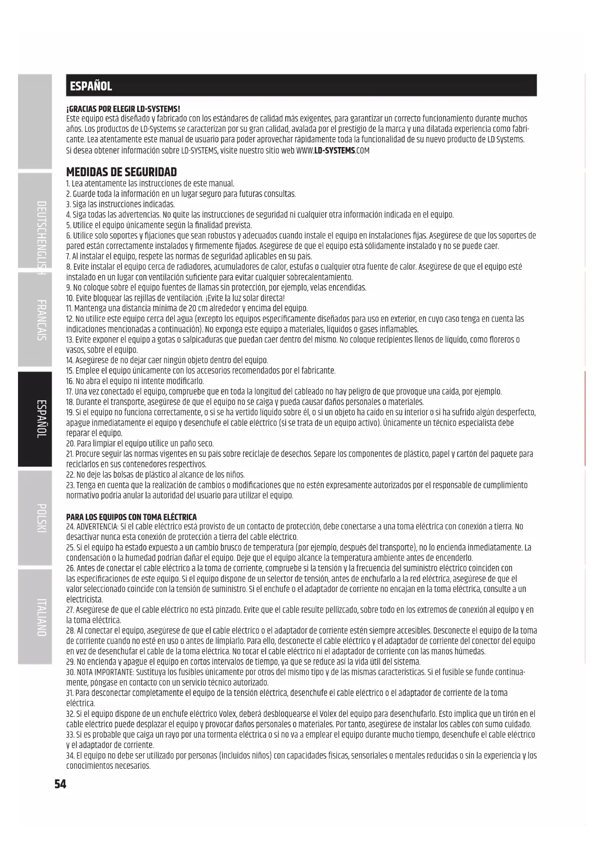 ¡GRACIAS POR ELEGIR LD-SYSTEMS! Este equipo está diseñado y fabricado con los estándares de calidad más exigentes, para garantizar un correcto funcionamiento durante muchos años. Los productos de LD-Systems se caracterizan por su gran calidad, avalada por el prestigio de la marca y una dilatada experiencia como fabri- cante. Lea atentamente este manual de usuario para poder aprovechar rápidamente toda la funcionalidad de su nuevo producto de LD Systems. Si desea obtener información sobre LD-SYSTEMS, visite nuestro sitio web WWW.LD-SYSTEMS.COM