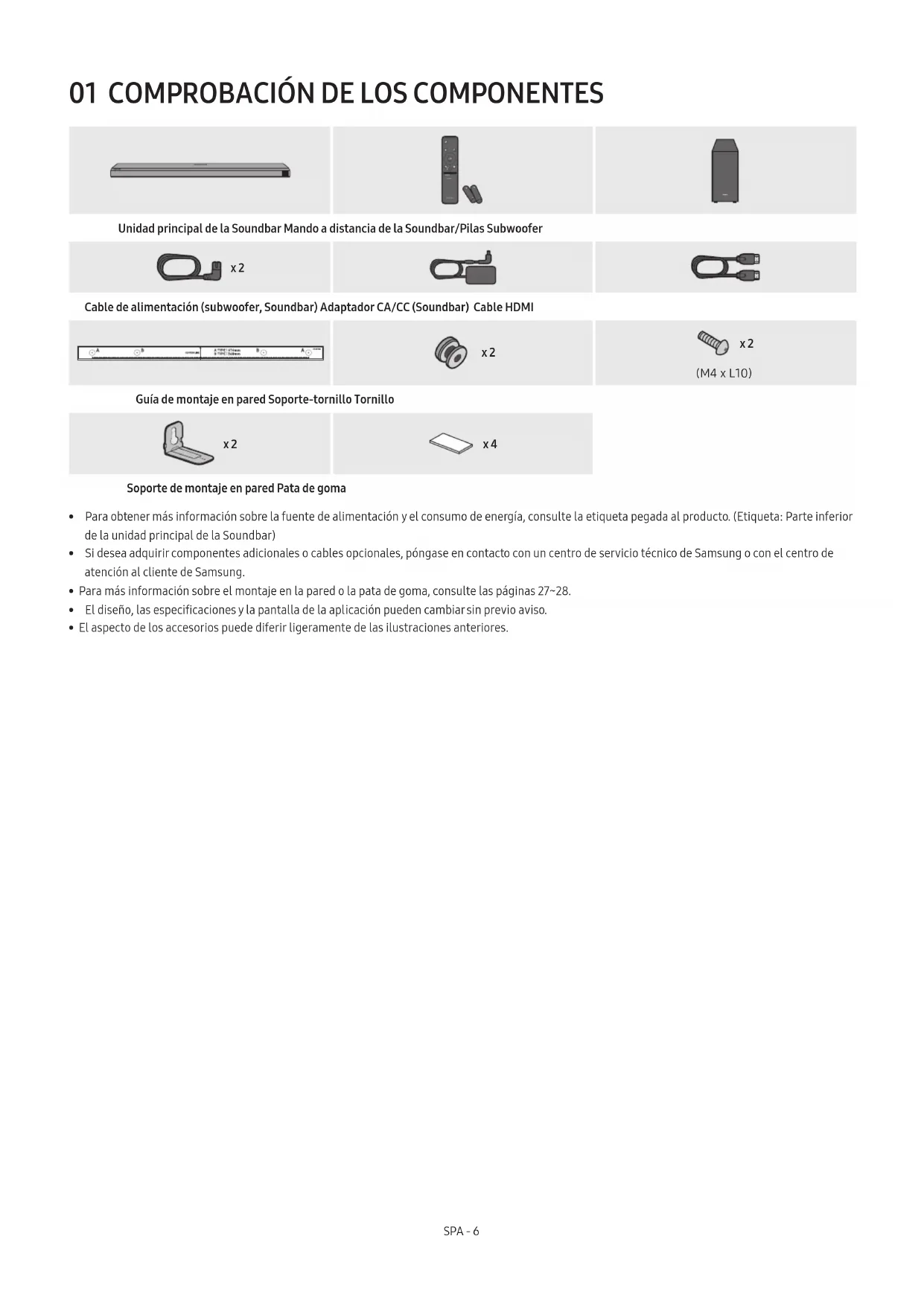 - son dañinos para el medioambiente. No deseche la batería en la basura doméstica general. No exponga la batería a un calor excesivo, a la luz directa del sol ni al fuego. Absténgase de desmontar la batería, así como de provocarle cortocircuitos o sobrecalentamientos. PRECAUCIÓN: Existe riesgo de explosión si la batería se reemplaza incorrectamente. Reemplace la batería solo por una igual o de especicaciones equivalentes.SPA - 4 CONTENIDO 01 Comprobación de los componentes 6 02 Visión general del producto 7 Panel delantero y panel superior de la Soundbar p. 7