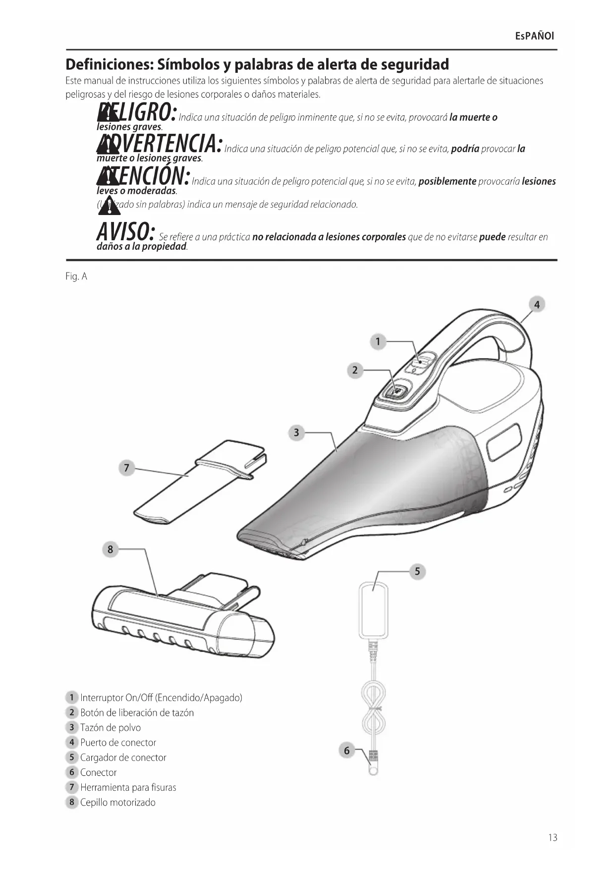 a ) Evite el arranque no intencional. Asegure que el interruptor esté en la posición apagada antes de recoger o transportar el aparato. Transportar el aparato con su dedo en el interruptor o energizar el aparato que tenga el interruptor encendido puede provocar accidentesb ) Recárguese sólo con el cargador especificado por el fabricante. Un cargador que sea adecuado para un tipo de batería puede ocasionar un riesgo de incendio si se utiliza con otrabatería.c ) No utilice una batería o aparato que esté dañado o modificado. Las baterías dañadas o modificadas pueden funcionar de forma imprevisible y ocasionar un incendio, explosión o riesgo delesión.d ) No exponga una batería o aparato al fuego ni a una temperatura excesiva. La exposición al fuego o a una temperatura superior a los 130°C (266°F) puede ocasionar unaexplosión.e ) La reparación debe realizarse por una persona calificada para realizar reparaciones que use solamente repuestos idénticos. Así se asegurará que se mantenga la seguridad delproducto.f ) Sólo use con cargadores S003AQU1500015 / SSC-150015US. CONSERVE ESTE MANUAL SÍMBOLOS La etiqueta de su herramienta puede incluir los siguientes símbolos. Los símbolos y sus definiciones son los siguientes:V..................................voltiosA .................................amperiosHz ...............................hertzW ................................vatiosmin ............................minutoso AC ..................corriente alternao DC ............corriente directa o ...............................no velocidad sin carga .............................Construcción Clase I............................... terminal a tierra (mis à la terre) ............................Construcción de clase II...........................simbolo de alerta.../min .......................revoluciones o minuto seguridad Wh ................................ Watt Horas Uso pretendido Su aspiradora inalámbrica de ion de litio BLACK+DECKER se diseñó para propósitos de aspirado en seco ligero. Este aparato está diseñado para uso doméstico únicamente. Carga de la batería