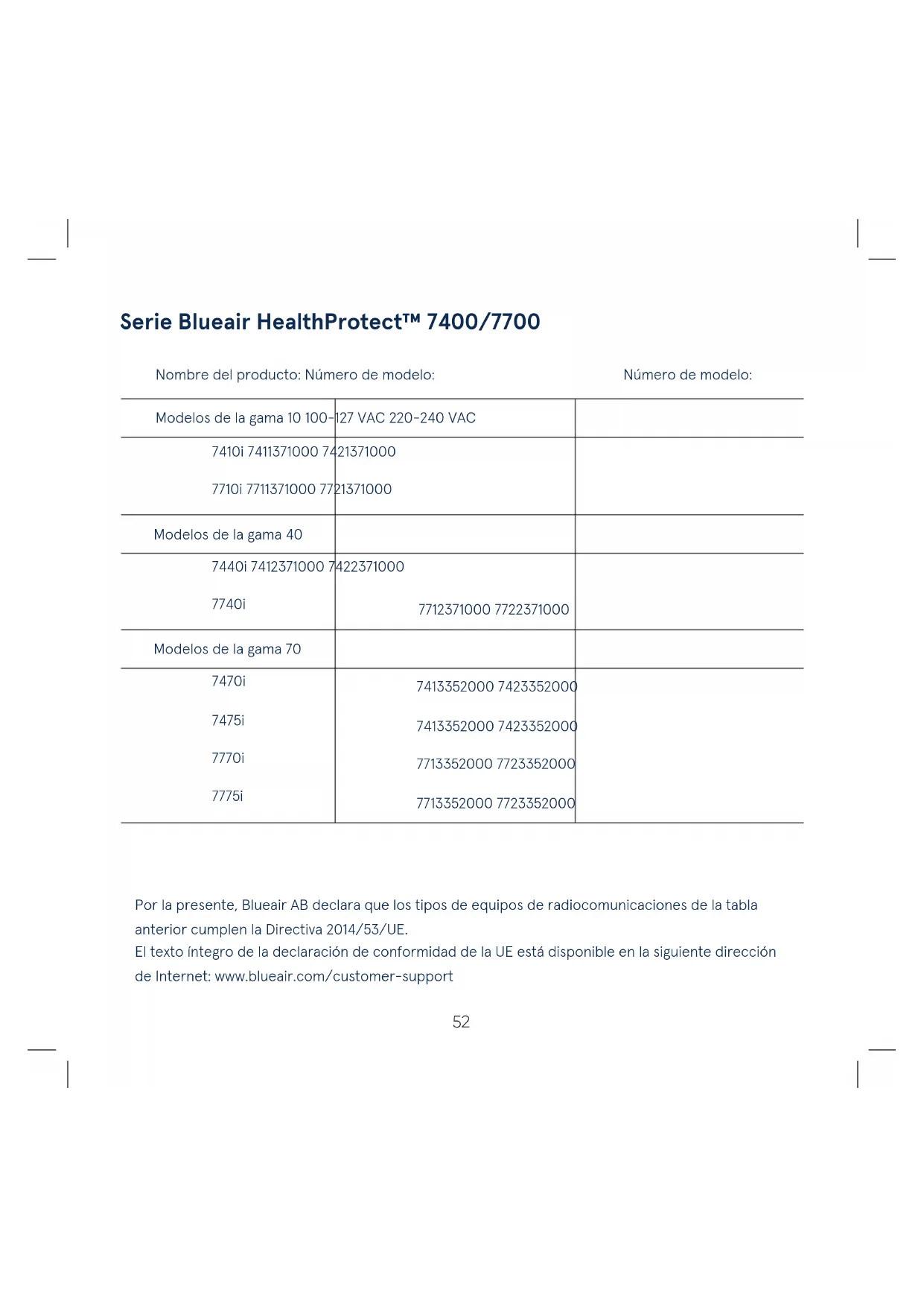 Por la presente, Blueair AB declara que los tipos de equipos de radiocomunicaciones de la tabla anterior cumplen la Directiva 2014/53/UE. El texto íntegro de la declaración de conformidad de la UE está disponible en la siguiente dirección de Internet: www.blueair.com/customer-support53