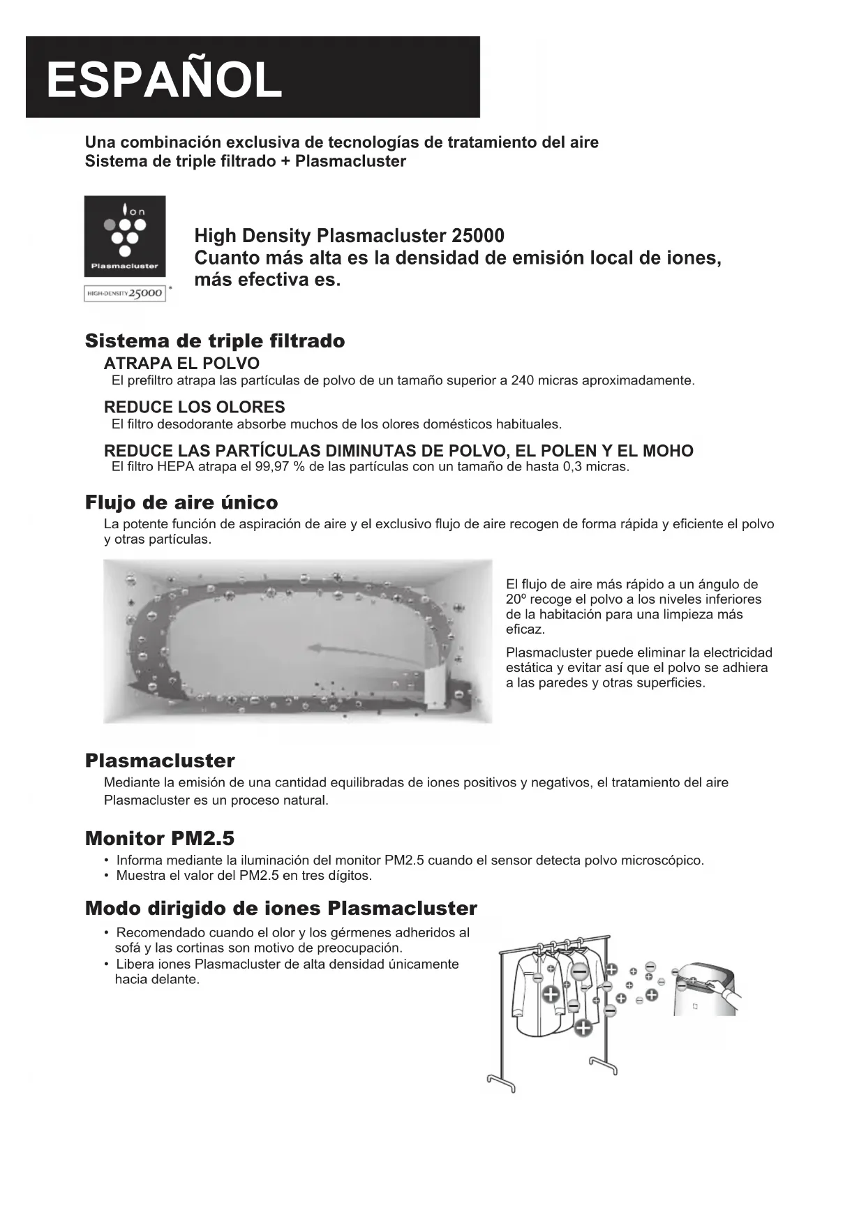 MEMOESPAÑOL Una combinación exclusiva de tecnologías de tratamiento del aire Sistema de triple filtrado + Plasmacluster High Density Plasmacluster 25000 Cuanto más alta es la densidad de emisión local de iones, más efectiva es. Sistema de triple filtrado