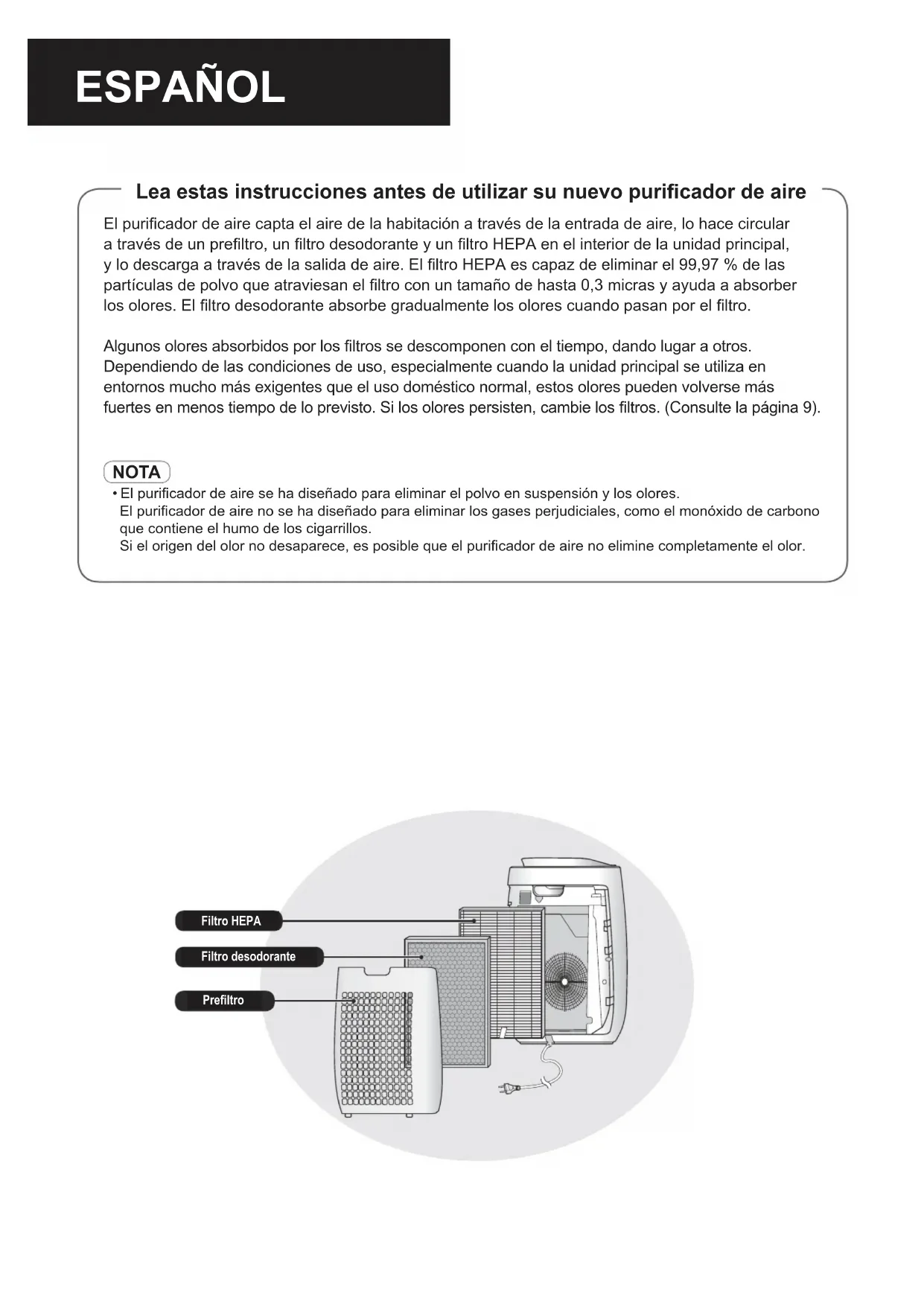 - El puricador de aire se ha diseñado para eliminar el polvo en suspensión y los olores. El puricador de aire no se ha diseñado para eliminar los gases perjudiciales, como el monóxido de carbono que contiene el humo de los cigarrillos. Si el origen del olor no desaparece, es posible que el puricador de aire no elimine completamente el olor. Lea estas instrucciones antes de utilizar su nuevo puricador de aire Filtro HEPAFiltro desodorantePreltroES-1