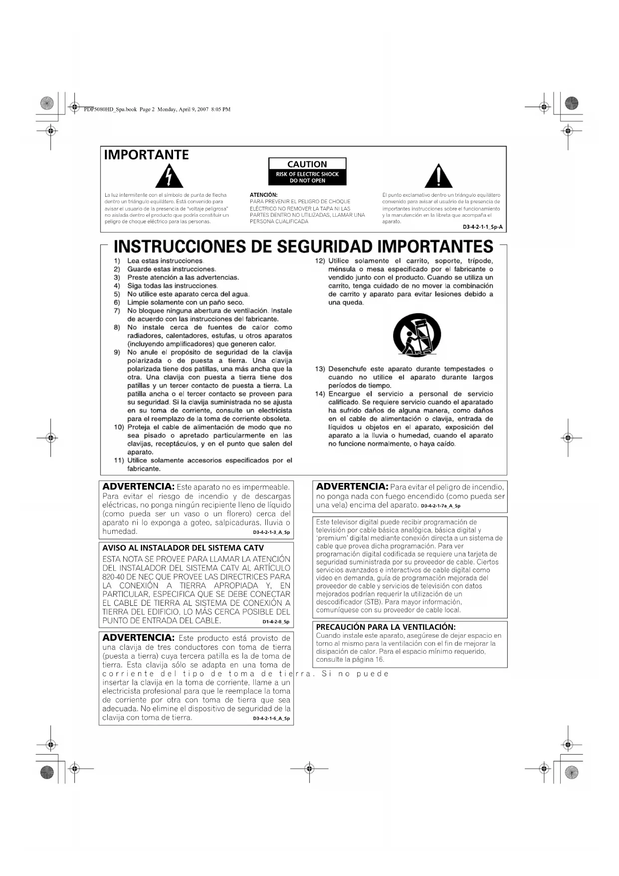 EL CABLE DE TIERRA AL SISTEMA DE CONEXIÓN A TIERRA DEL EDIFICIO, LO MÁS CERCA POSIBLE DEL PUNTO DE ENTRADA DEL CABLE. D1-4-2-8_Sp ADVERTENCIA: Este producto está provisto de una clavija de tres conductores con toma de tierra (puesta a tierra) cuya tercera patilla es la de toma de tierra. Esta clavija sólo se adapta en una toma de corriente del tipo de toma de tierra. Si no puede insertar la clavija en la toma de corriente, llame a un electricista profesional para que le reemplace la toma de corriente por otra con toma de tierra que sea adecuada. No elimine el dispositivo de seguridad de la clavija con toma de tierra. D3-4-2-1-6_A_Sp ADVERTENCIA: Para evitar el peligro de incendio, no ponga nada con fuego encendido (como pueda ser una vela) encima del aparato. D3-4-2-1-7a_A_Sp Este televisor digital puede recibir programación de televisión por cable básica analógica, básica digital y ‘premium’ digital mediante conexión directa a un sistema de cable que provea dicha programación. Para ver programación digital codificada se requiere una tarjeta de seguridad suministrada por su proveedor de cable. Ciertos servicios avanzados e interactivos de cable digital como video en demanda, guía de programación mejorada del proveedor de cable y servicios de televisión con datos mejorados podrían requerir la utilización de un descodificador (STB). Para mayor información, comuníquese con su proveedor de cable local. PRECAUCIÓN PARA LA VENTILACIÓN: Cuando instale este aparato, asegúrese de dejar espacio en torno al mismo para la ventilación con el fin de mejorar la disipación de calor. Para el espacio mínimo requerido, consulte la página 16. PDP5080HD_Spa.book Page 2 Monday, April 9, 2007 8:05 PMEspañol ADVERTENCIA: Las ranuras y aberturas de la caja del aparato sirven para su ventilación para poder asegurar un funcionamiento fiable del aparato y para protegerlo contra sobrecalentamiento. Para evitar el peligro de incendio, las aberturas nunca deberán taparse ni cubrirse con nada (como por ejemplo, periódicos, manteles, cortinas) ni ponerse en funcionamiento el aparato sobre una alfombra gruesas o una cama. Información al usuario Cambios o modificaciones realizados sin la autorización apropiada pueden invalidar el derecho del usuario de operar el equipo. [Para el modelo canadiense] Este aparato digital de clase B cumple con la norma ICES-003 del Canadá.