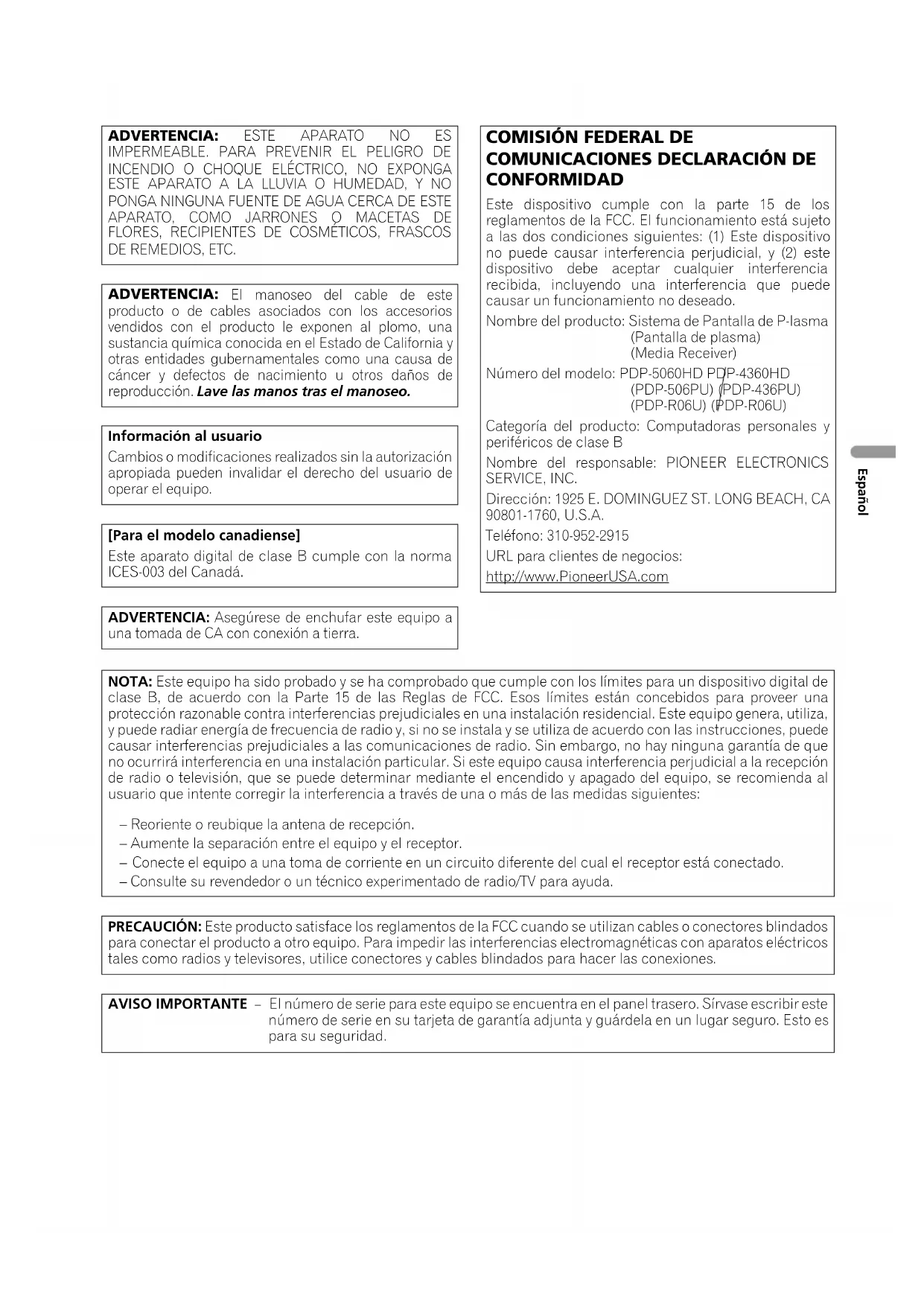 CONFORMIDAD Este dispositivo cumple con la parte 15 de los reglamentos de la FCC. El funcionamiento está sujeto a las dos condiciones siguientes: (1) Este dispositivo no puede causar interferencia perjudicial, y (2) este dispositivo debe aceptar cualquier interferencia recibida, incluyendo una interferencia que puede causar un funcionamiento no deseado. Nombre del producto: Sistema de Pantalla de P-lasma (Pantalla de plasma) (Media Receiver) Número del modelo: PDP-5060HD PDP-4360HD (PDP-506PU) (PDP-436PU) (PDP-R06U) (PDP-R06U) Categoría del producto: Computadoras personales y periféricos de clase B Nombre del responsable: PIONEER ELECTRONICS SERVICE, INC. Dirección: 1925 E. DOMINGUEZ ST. LONG BEACH, CA 90801-1760, U.S.A. Teléfono: 310-952-2915 URL para clientes de negocios: http://www.PioneerUSA.com NOTA: Este equipo ha sido probado y se ha comprobado que cumple con los límites para un dispositivo digital de clase B, de acuerdo con la Parte 15 de las Reglas de FCC. Esos límites están concebidos para proveer una protección razonable contra interferencias prejudiciales en una instalación residencial. Este equipo genera, utiliza, y puede radiar energía de frecuencia de radio y, si no se instala y se utiliza de acuerdo con las instrucciones, puede causar interferencias prejudiciales a las comunicaciones de radio. Sin embargo, no hay ninguna garantía de que no ocurrirá interferencia en una instalación particular. Si este equipo causa interferencia perjudicial a la recepción de radio o televisión, que se puede determinar mediante el encendido y apagado del equipo, se recomienda al usuario que intente corregir la interferencia a través de una o más de las medidas siguientes: – Reoriente o reubique la antena de recepción. – Aumente la separación entre el equipo y el receptor. – Conecte el equipo a una toma de corriente en un circuito diferente del cual el receptor está conectado. – Consulte su revendedor o un técnico experimentado de radio/TV para ayuda. PRECAUCIÓN: Este producto satisface los reglamentos de la FCC cuando se utilizan cables o conectores blindados para conectar el producto a otro equipo. Para impedir las interferencias electromagnéticas con aparatos eléctricos tales como radios y televisores, utilice conectores y cables blindados para hacer las conexiones. AVISO IMPORTANTE – El número de serie para este equipo se encuentra en el panel trasero. Sírvase escribir este número de serie en su tarjeta de garantía adjunta y guárdela en un lugar seguro. Esto es para su seguridad.4