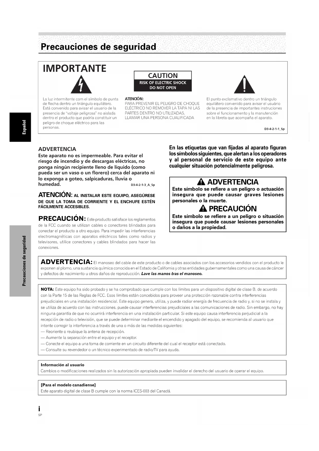EspañolPrecauciones de seguridad Precauciones de seguridad El punto exclamativo dentro un triángulo equilátero convenido para avisar el usuário de la presencia de importantes instruciones sobre el funcionamento y la manutención en la libreta que acompaña el aparato.La luz intermitente com el símbolo de punta de flecha dentro un triángulo equilátero. Está convenido para avisar el usuario de la presencia de “voltaje peligrosa” no aislada dentro el producto que podría constituir un peligro de choque eléctrico para las personas. IMPORTANTE ATENCIÓN:PARA PREVENIR EL PELIGRO DE CHOQUE ELÉCTRICO NO REMOVER LA TAPA NI LAS PARTES DENTRO NO UTILIZADAS, LLAMAR UNA PERSONA CUALIFICADA CAUTION RISK OF ELECTRIC SHOCKDO NOT OPEND3-4-2-1-1_Sp ADVERTENCIA Este aparato no es impermeable. Para evitar el riesgo de incendio y de descargas eléctricas, no ponga ningún recipiente lleno de líquido (como pueda ser un vaso o un florero) cerca del aparato ni lo exponga a goteo, salpicaduras, lluvia o humedad. D3-4-2-1-3_A_Sp ATENCIÓN: AL INSTALAR ESTE EQUIPO, ASEGÚRESE DE QUE LA TOMA DE CORRIENTE Y EL ENCHUFE ESTÉN FÁCILMENTE ACCESIBLES. En las etiquetas que van fijadas al aparato figuran los símbolos siguientes, que alertan a los operadores y al personal de servicio de este equipo ante cualquier situación potencialmente peligrosa. ADVERTENCIA Este símbolo se refiere a un peligro o actuación insegura que puede causar graves lesiones personales o la muerte. PRECAUCIÓN Este símbolo se refiere a un peligro o situación insegura que puede causar lesiones personales o daños a la propiedad.