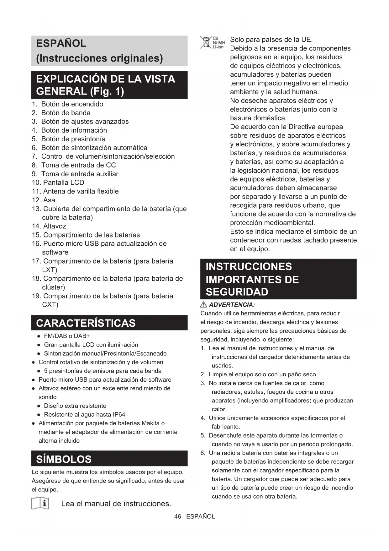 CXT) CARACTERÍSTICAS ● FM/DAB o DAB+ ● Gran pantalla LCD con iluminación ● Sintonización manual/Presintonía/Escaneado ● Control rotativo de sintonización y de volumen ● 5 presintonías de emisora para cada banda ● Puerto micro USB para actualización de software ● Altavoz estéreo con un excelente rendimiento de sonido ● Diseño extra resistente ● Resistente al agua hasta IP64 ● Alimentación por paquete de baterías Makita o mediante el adaptador de alimentación de corriente alterna incluido SÍMBOLOS Lo siguiente muestra los símbolos usados por el equipo. Asegúrese de que entiende su significado, antes de usar el equipo. Lea el manual de instrucciones. Solo para países de la UE. Debido a la presencia de componentes peligrosos en el equipo, los residuos de equipos eléctricos y electrónicos, acumuladores y baterías pueden tener un impacto negativo en el medio ambiente y la salud humana. No deseche aparatos eléctricos y electrónicos o baterías junto con la basura doméstica. De acuerdo con la Directiva europea sobre residuos de aparatos eléctricos y electrónicos, y sobre acumuladores y baterías, y residuos de acumuladores y baterías, así como su adaptación a la legislación nacional, los residuos de equipos eléctricos, baterías y acumuladores deben almacenarse por separado y llevarse a un punto de recogida para residuos urbano, que funcione de acuerdo con la normativa de protección medioambiental. Esto se indica mediante el símbolo de un contenedor con ruedas tachado presente en el equipo. INSTRUCCIONES IMPORTANTES DE SEGURIDAD ADVERTENCIA: Cuando utilice herramientas eléctricas, para reducir el riesgo de incendio, descarga eléctrica y lesiones personales, siga siempre las precauciones básicas de seguridad, incluyendo lo siguiente: