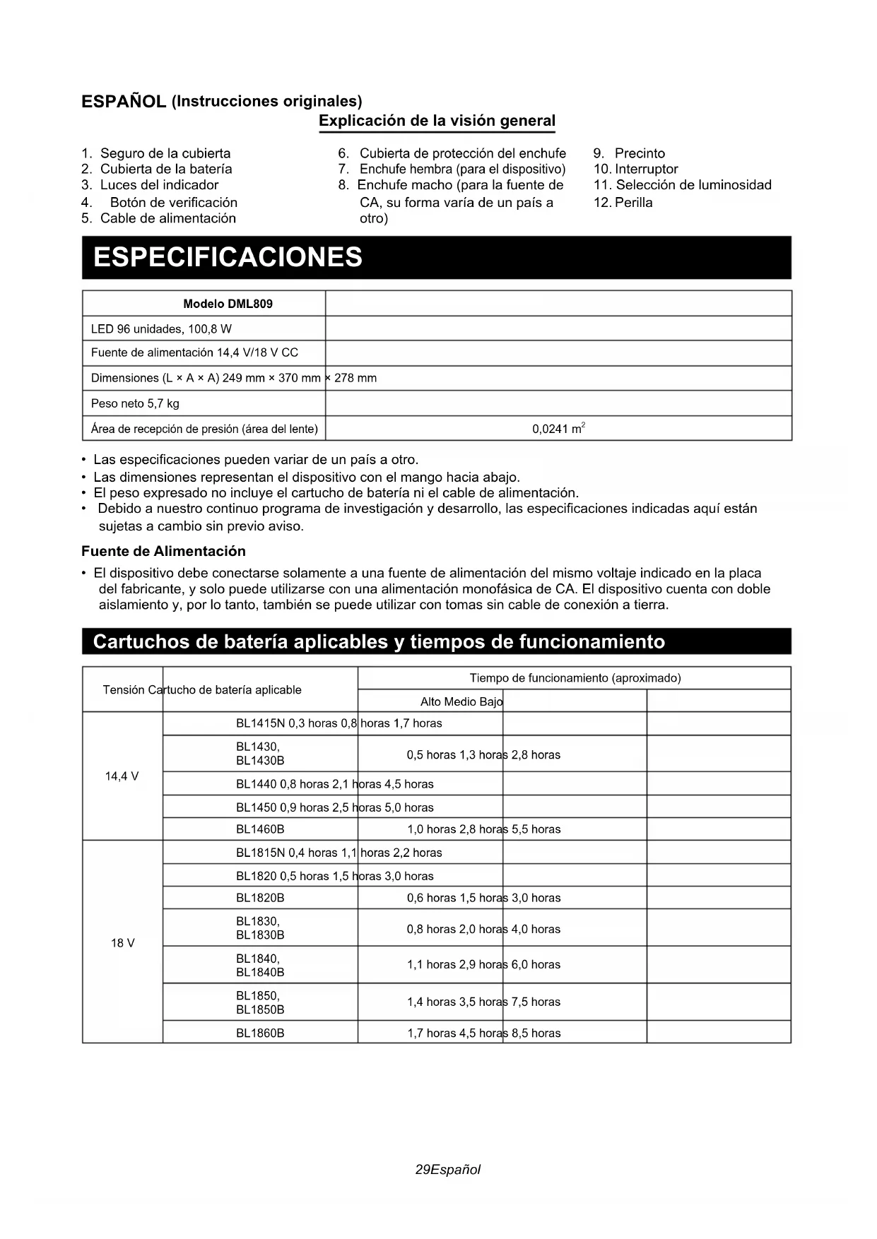 Cubierta de protección del enchufe Enchufe hembra (para el dispositivo)8. Enchufe macho (para la fuente de CA, su forma varía de un país a otro)9. Precinto10. Interruptor11. Selección de luminosidad12. Perilla ESPECIFICACIONES Modelo DML809LED 96 unidades, 100,8 WFuente de alimentación 14,4 V/18 V CCDimensiones (L × A × A) 249 mm × 370 mm × 278 mmPeso neto 5,7 kgÁrea de recepción de presión (área del lente)0,0241 m