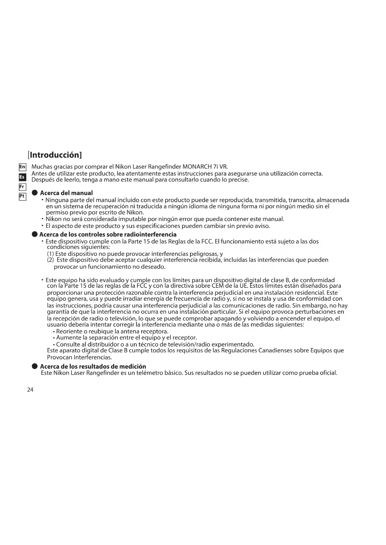 - Consulte al distribuidor o a un técnico de televisión/radio experimentado. Este aparato digital de Clase B cumple todos los requisitos de las Regulaciones Canadienses sobre Equipos que Provocan Interferencias. ● Acerca de los resultados de medición Este Nikon Laser Rangefinder es un telémetro básico. Sus resultados no se pueden utilizar como prueba oficial. [Introducción] Muchas gracias por comprar el Nikon Laser Rangefinder MONARCH 7i VR. Antes de utilizar este producto, lea atentamente estas instrucciones para asegurarse una utilización correcta. Después de leerlo, tenga a mano este manual para consultarlo cuando lo precise.25