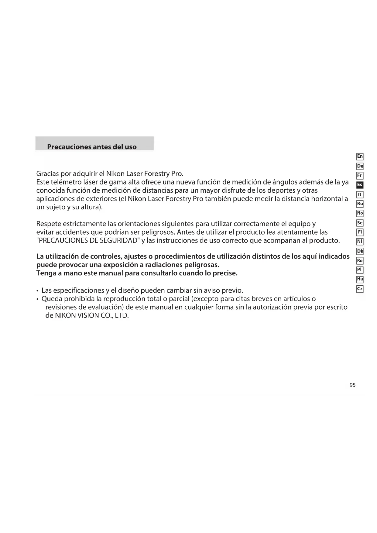 Precauciones antes del uso Gracias por adquirir el Nikon Laser Forestry Pro. Este telémetro láser de gama alta ofrece una nueva función de medición de ángulos además de la ya conocida función de medición de distancias para un mayor disfrute de los deportes y otras aplicaciones de exteriores (el Nikon Laser Forestry Pro también puede medir la distancia horizontal a un sujeto y su altura). Respete estrictamente las orientaciones siguientes para utilizar correctamente el equipo y evitar accidentes que podrían ser peligrosos. Antes de utilizar el producto lea atentamente las "PRECAUCIONES DE SEGURIDAD" y las instrucciones de uso correcto que acompañan al producto. La utilización de controles, ajustes o procedimientos de utilización distintos de los aquí indicados puede provocar una exposición a radiaciones peligrosas. Tenga a mano este manual para consultarlo cuando lo precise.