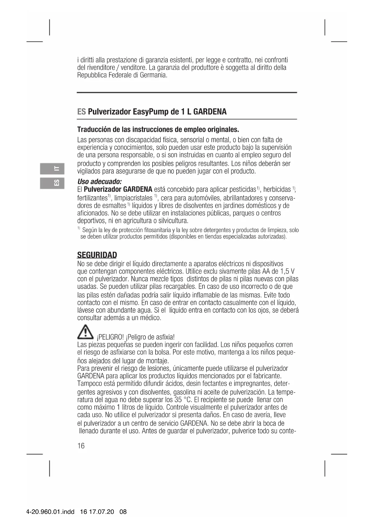 Según la ley de protección fitosanitaria y la ley sobre detergentes y productosde limpieza, solo se deben utilizar productos permitidos (disponibles en tiendas especializadas autorizadas). SEGURIDAD No se debe dirigir el líquido directamente a aparatos eléctricos ni dispositivos que contengan componentes eléctricos. Utilice exclu sivamente pilas AA de 1,5 V con el pulverizador. Nunca mezcle tipos distintos de pilas ni pilas nuevas con pilas usadas. Se pueden utilizar pilas recargables. En caso de uso incorrecto o de que las pilas estén dañadas podría salir líquido inflamable de las mismas. Evite todo contacto con el mismo. En caso de entrar en contacto casualmente con el líquido, lávese con abundante agua. Si el líquido entra en contacto con los ojos, se deberá consultar además aun médico. ¡PELIGRO! ¡Peligro de asfixia! Las piezas pequeñas se pueden ingerir con facilidad. Los niños pequeños corren el riesgo de asfixiarse con la bolsa. Por este motivo, mantenga a los niños peque- ños alejados del lugar de montaje. Para prevenir el riesgo de lesiones, únicamente puede utilizarse el pulverizador GARDENA para aplicar los productos líquidos mencionados por el fabricante. Tampoco está permitido difundir ácidos, desin fectantes e impregnantes, deter- gentes agresivos y con disolventes, gasolina ni aceite de pulverización. La tempe- ratura del agua no debe superar los 35 °C. El recipiente se puede llenar con como máximo 1 litros de líquido. Controle visualmente el pulverizador antes de cada uso. No utilice el pulverizador si presenta daños. En caso de avería, lleve el pulverizador a un centro de servicio GARDENA. No se debe abrir la boca de llenado durante el uso. Antes de guardar el pulverizador, pulverice todo su conte- 11114-20.960.01.indd 16 17.07.20 08:26ES