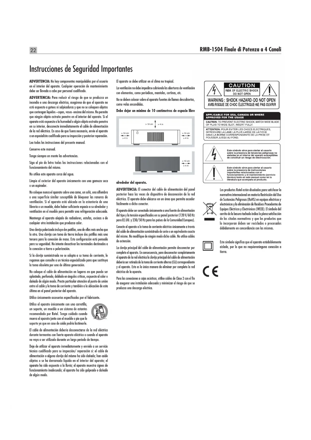 /9’’ Nettogewicht 14.9 kg, 32.8 lbs Diese Bedienungsanleitung entspricht dem technischen Stand bei Drucklegung. Änderungen in Technik und Ausstattung vorbehalten. Rotel und das Rotel-Logo sind eingetragene Markenzeichen von The Rotel Co., Ltd. Tokio, Japan.22 RMB-1504 Finale di Potenza a 4 Canali ADVERTENCIA: No hay componentes manipulables por el usuario en el interior del aparato. Cualquier operación de mantenimiento debe ser llevada a cabo por personal cualificado. ADVERTENCIA: Para reducir el riesgo de que se produzca un incendio o una descarga eléctrica, asegúrese de que el aparato no esté expuesto a goteos ni salpicaduras y que no se coloquen objetos que contengan líquidos –copas, vasos- encima del mismo. No permita que ningún objeto extraño penetre en el interior del aparato. Si el aparato está expuesto a la humedad o algún objeto extraño penetra en su interior, desconecte inmediatamente el cable de alimentación de la red eléctrica. En caso de que fuera necesario, envíe el aparato a un especialista cualificado para su inspección y posterior reparación. Lea todas las instrucciones del presente manual. Conserve este manual. Tenga siempre en mente las advertencias. Siga al pie de letra todas las instrucciones relacionadas con el funcionamiento del mismo. No utilice este aparato cerca del agua. Limpie el exterior del aparato únicamente con una gamuza seca o un aspirador. No coloque nunca el aparato sobre una cama, un sofá, una alfombra o una superficie similar susceptible de bloquear las ranuras de ventilación. Si el aparato está ubicado en la estantería de una librería o un mueble, debe haber suficiente espacio a su alrededor y ventilación en el mueble para permitir una refrigeración adecuada. Mantenga el aparato alejado de radiadores, estufas, cocinas o de cualquier otra instalación que produzca calor. Una clavija polarizada incluye dos patillas, una de ellas más ancha que la otra. Una clavija con toma de tierra incluye dos patillas más una tercera para la conexión de masa. Esta configuración está pensada para su seguridad. No intente desactivar los terminales destinados a la conexión a tierra o polarización. Si la clavija suministrada no se adapta a su toma de corriente, le rogamos que consulte a un técnico especializado para que sustituya la toma obsoleta por una de última generación. No coloque el cable de alimentación en lugares en que pueda ser aplastado, perforado, doblado en ángulos críticos, expuesto al calor o dañado de algún modo. Preste particular atención al punto de unión entre el cable y la toma de corriente y también a la ubicación de esta última en el panel posterior del aparato. Utilice únicamente accesorios especificados por el fabricante. Utilice el aparato únicamente con una carretilla, un soporte, un mueble o un sistema de estantes recomendado por Rotel. Tenga cuidado cuando mueva el aparato junto con el mueble o pie que lo soporte ya que en caso de caída podría lastimarle. El cable de alimentación debería desconectarse de la red eléctrica durante tormentas con fuerte aparato eléctrico o cuando el aparato no vaya a ser utilizado durante un largo período de tiempo. Deje de utilizar el aparato inmediatamente y envíelo a un servicio técnico cualificado para su inspección/ reparación si: el cable de alimentación o alguna clavija del mismo ha sido dañado; han caído objetos o se ha derramado líquido en el interior del aparato; el aparato ha sido expuesto a la lluvia; el aparato muestra signos de funcionamiento inadecuado; el aparato ha sido golpeado o dañado de algún modo. Los productos Rotel están diseñados para satisfacer la normativa internacional en materia Restricción del Uso de Sustancias Peligrosas (RoHS) en equipos eléctricos y electrónicos y la eliminación de Residuos Procedentes de Equipos Eléctricos y Electrónicos (WEEE). El símbolo del carrito de la basura tachado indica la plena satisfacción de las citadas normativas y que los productos que lo incorporan deben ser reciclados o procesados debidamente en concordancia con las mismas. Instrucciones de Seguridad Importantes El aparato se debe utilizar en el clima no tropical. La ventilación no debe impedirse cubriendo las aberturas de ventilación con elementos, como periódicos, manteles, cortinas, etc. No se deben colocar sobre el aparato fuentes de llamas descubiertas, como velas encendidas. Debe dejar un mínimo de 10 centímetros de espacio libre alrededor del aparato. ADVERTENCIA: El conector del cable de alimentación del panel posterior hace las veces de dispositivo de desconexión de la red eléctrica. El aparato debe ubicarse en un área que permita acceder fácilmente a dicho conector. El aparato debe ser conectado únicamente a una fuente de alimentación del tipo y la tensión especificados en su panel posterior (120 V/60 Hz para EE.UU. y 230/50 Hz para los países de la Comunidad Europea). Conecte el aparato a la toma de corriente eléctrica únicamente a través del cable de alimentación suministrado de serie o un equivalente exacto del mismo. No modifique de ningún modo dicho cable. No utilice cables de extensión. La clavija principal del cable de alimentación permite desconectar por completo el aparato. En consecuencia, para desconectar completamente el aparato de la red eléctrica la clavija principal del cable de alimentación debería ser retirada de la toma de corriente alterna (CA) correspondiente y el aparato. Esta es la única manera de eliminar por completo la red eléctrica de la aparato. Para las conexiones a cajas acústicas, utilice cables de Clase 2 con el fin de asegurar una instalación adecuada y minimizar el riesgo de que se produzca una descarga eléctrica. Este símbolo sirve para alertar al usuario sobre la presencia de tensiones peligrosas no aisladas en el interior del aparato susceptibles de constituir un riesgo de electrocución. Este símbolo sirve para alertar al usuario sobre la pres