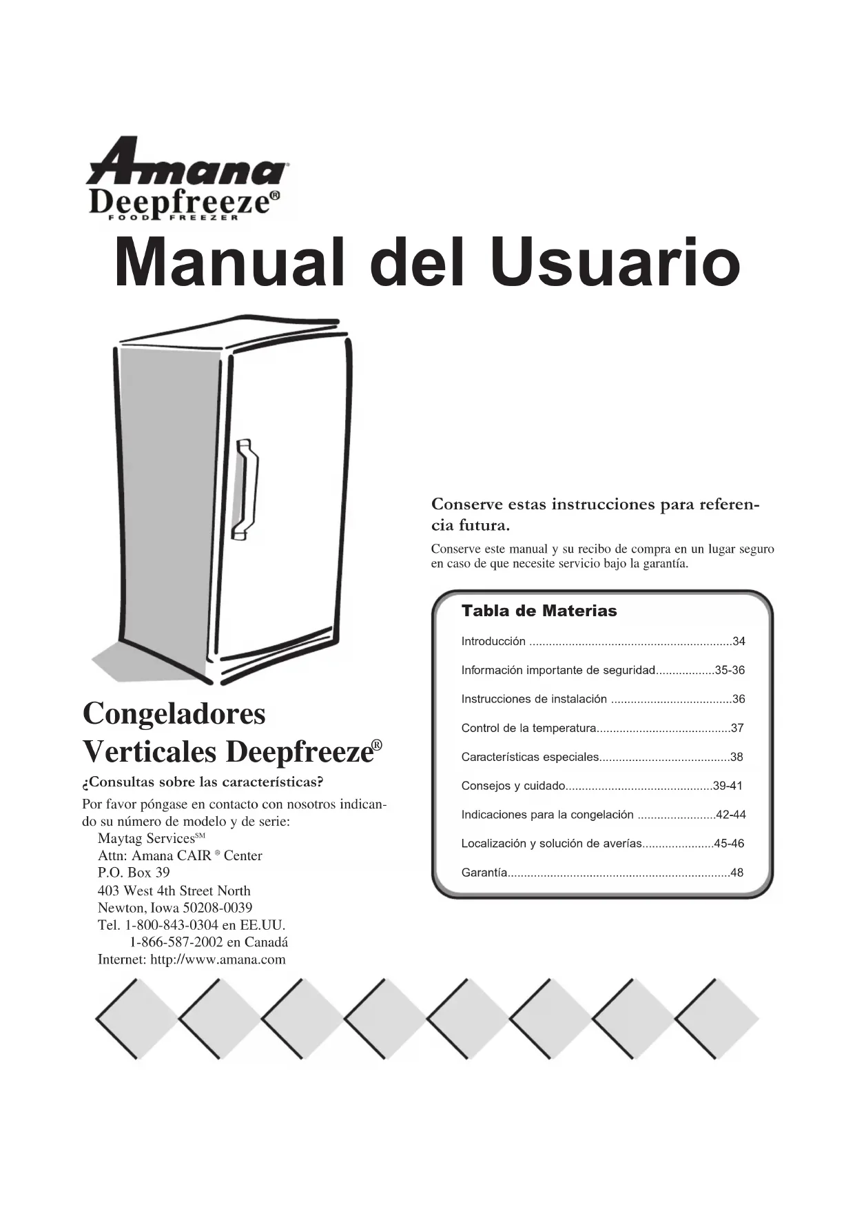 - wton, Iowa 50208-0039 Tel. 1-800-843-0304 en EE.UU. 1-866-587-2002 en Canadá Internet: http://www.amana.com Manual del Usuario Conserve estas instrucciones para referen- cia futura. Conserve este manual y su recibo de compra en un lugar seguroen caso de que necesite servicio bajo la garantía. Tabla de Materias Introducción p. 34