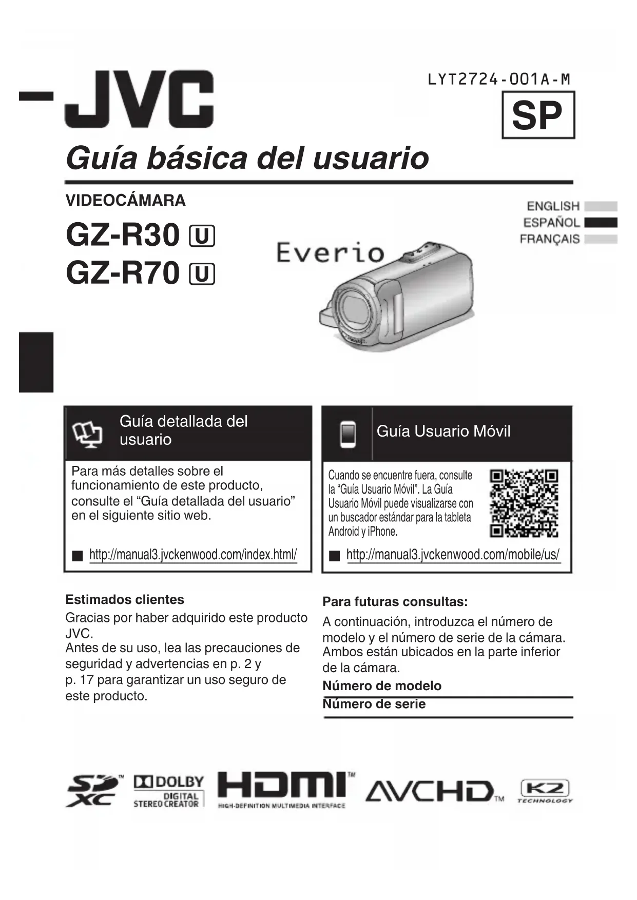 Descarga las instrucciones para tu Videocámara en formato PDF gratis! Encuentra tus instrucciones Everio GZR30 - JVC y toma tu dispositivo electrónico nuevamente en la mano. En esta página están publicados todos los documentos necesarios para el uso de su dispositivo. Everio GZR30 de la marca JVC.